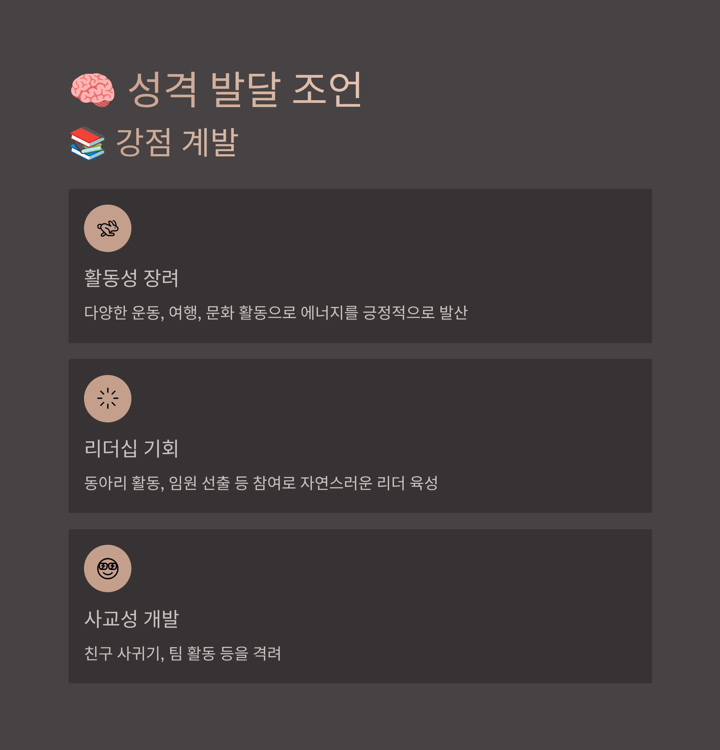 활동성 장려: 다양한 운동, 여행, 문화 활동을 통해 에너지를 긍정적으로 발산하도록 합니다.