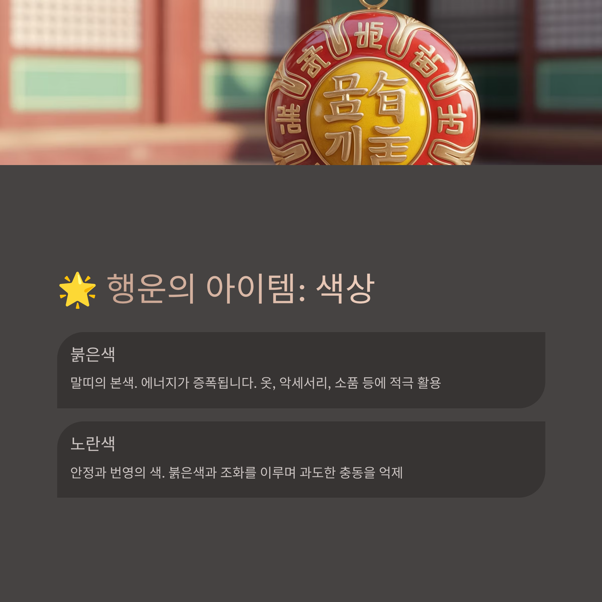 붉은색: 말띠의 본색인 붉은색을 활용하면 에너지가 증폭됩니다. 옷, 악세서리, 소품 등에 적극 활용합니다.