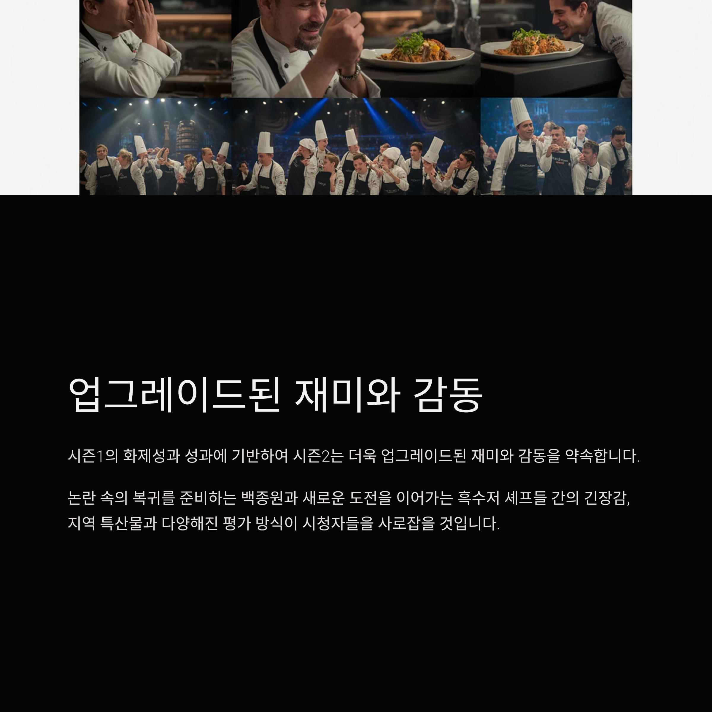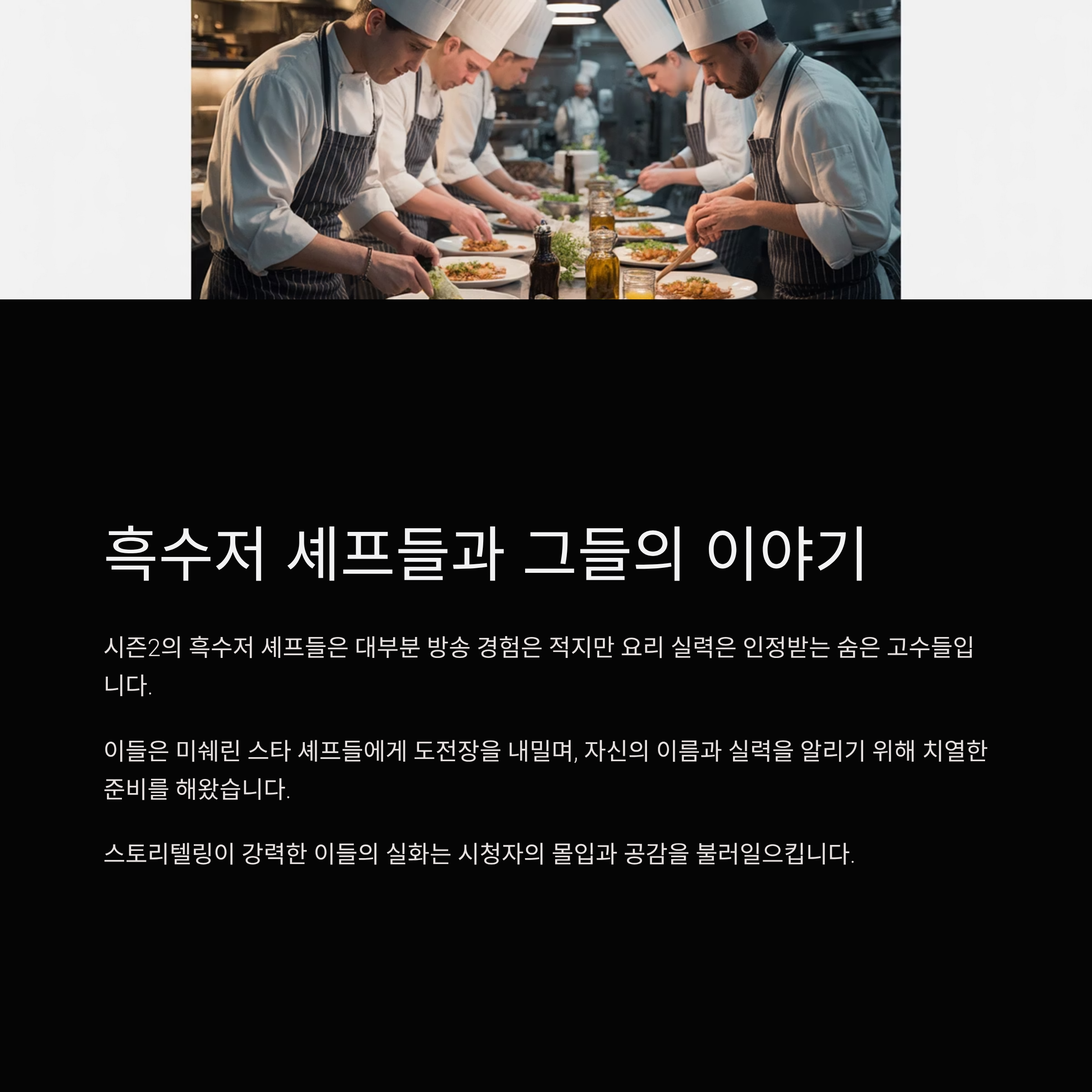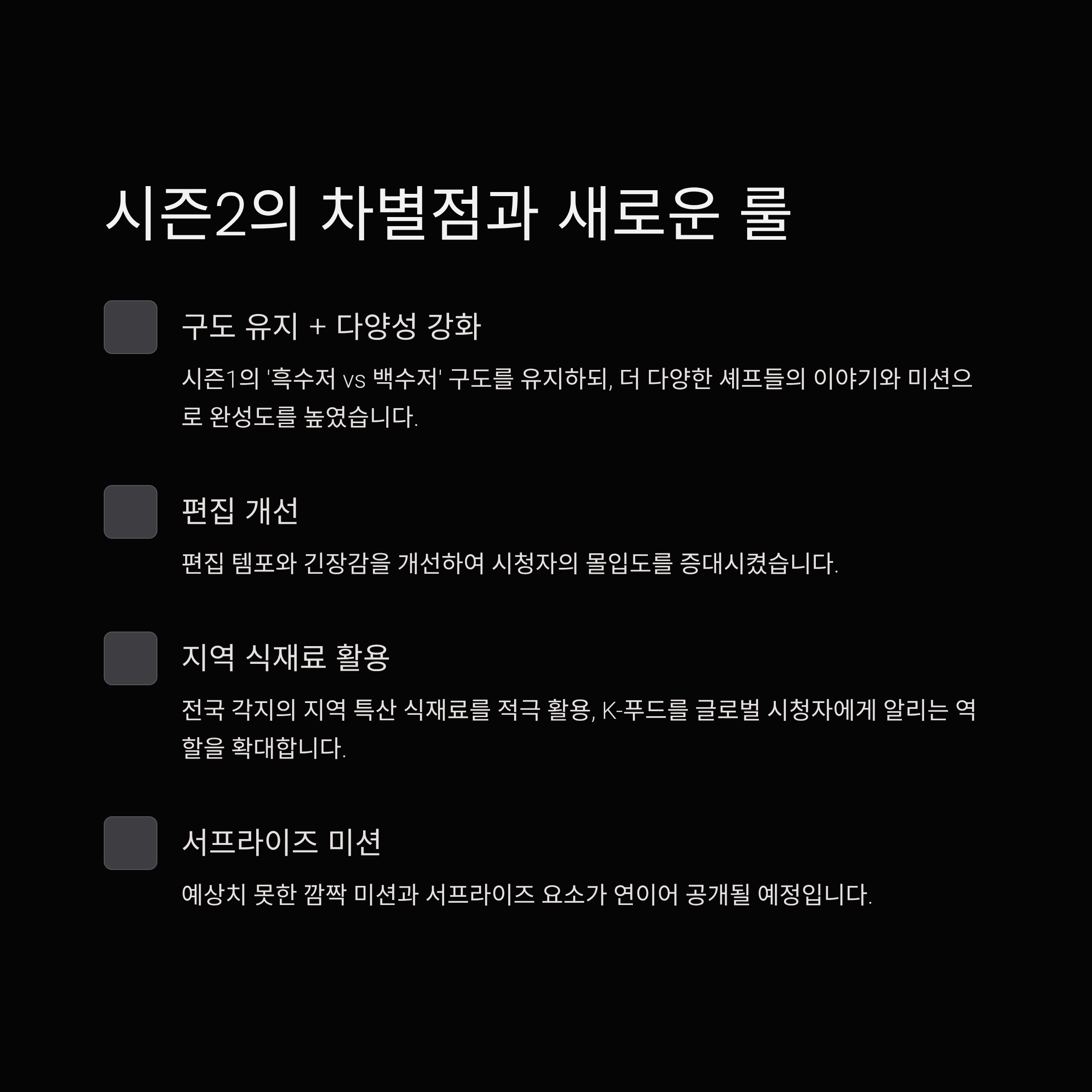 - 시즌1의 ‘흑수저 vs 백수저’ 구도를 유지하되, 더 다양한 셰프들의 이야기와 미션으로 완성도를 높였습니다.