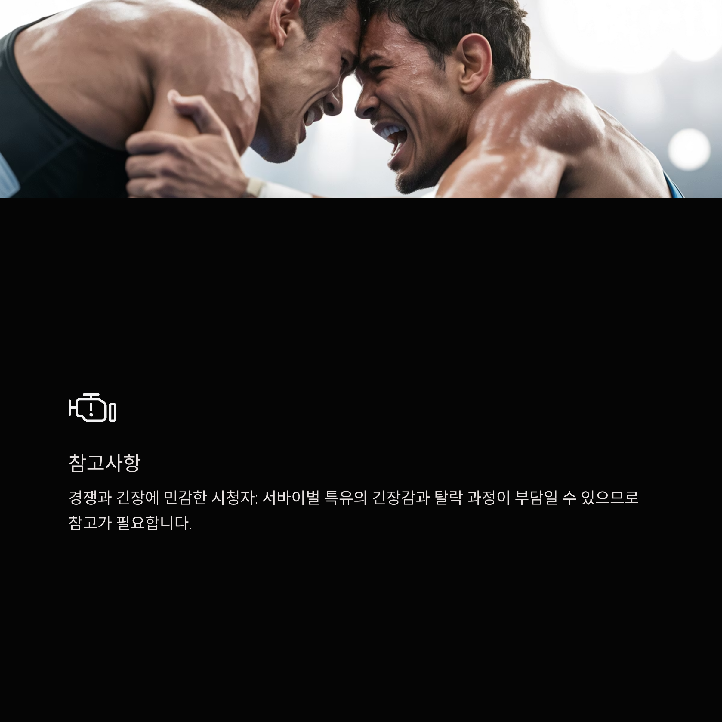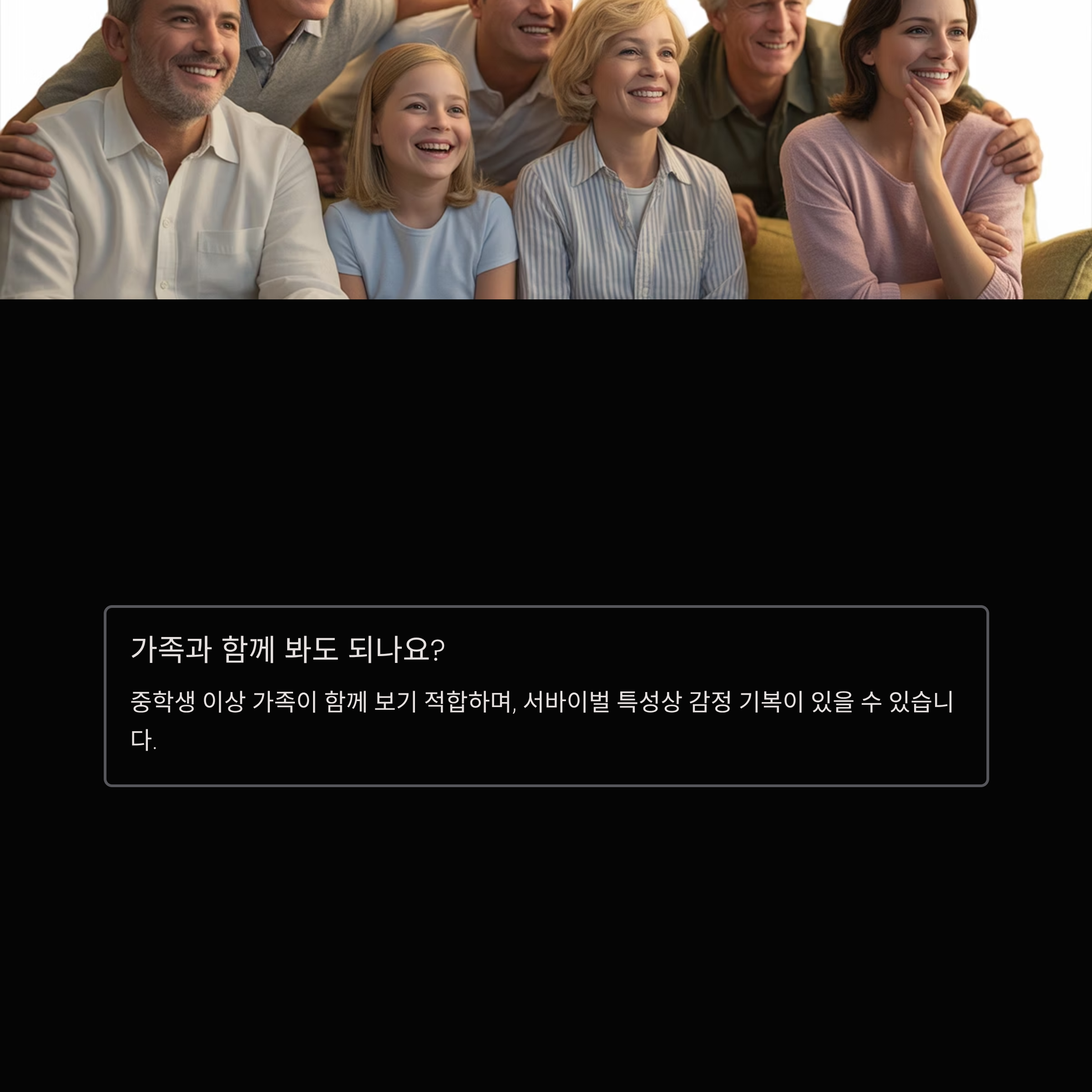 - 중학생 이상 가족이 함께 보기 적합하며, 서바이벌 특성상 감정 기복이 있을 수 있습니다.
