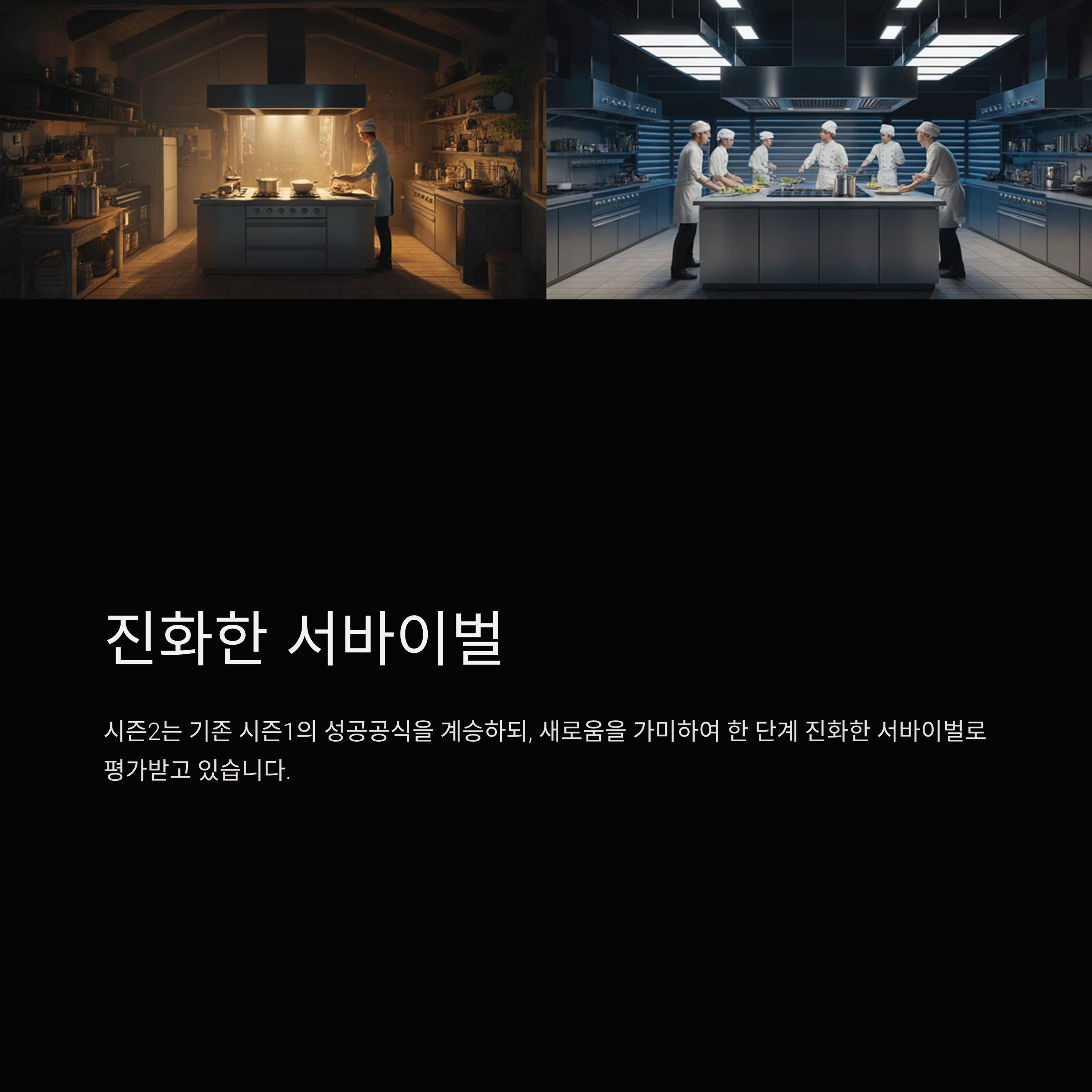 시즌2는 기존 시즌1의 성공공식을 계승하되, 새로움을 가미하여 한 단계 진화한 서바이벌로 평가받고 있습니다.