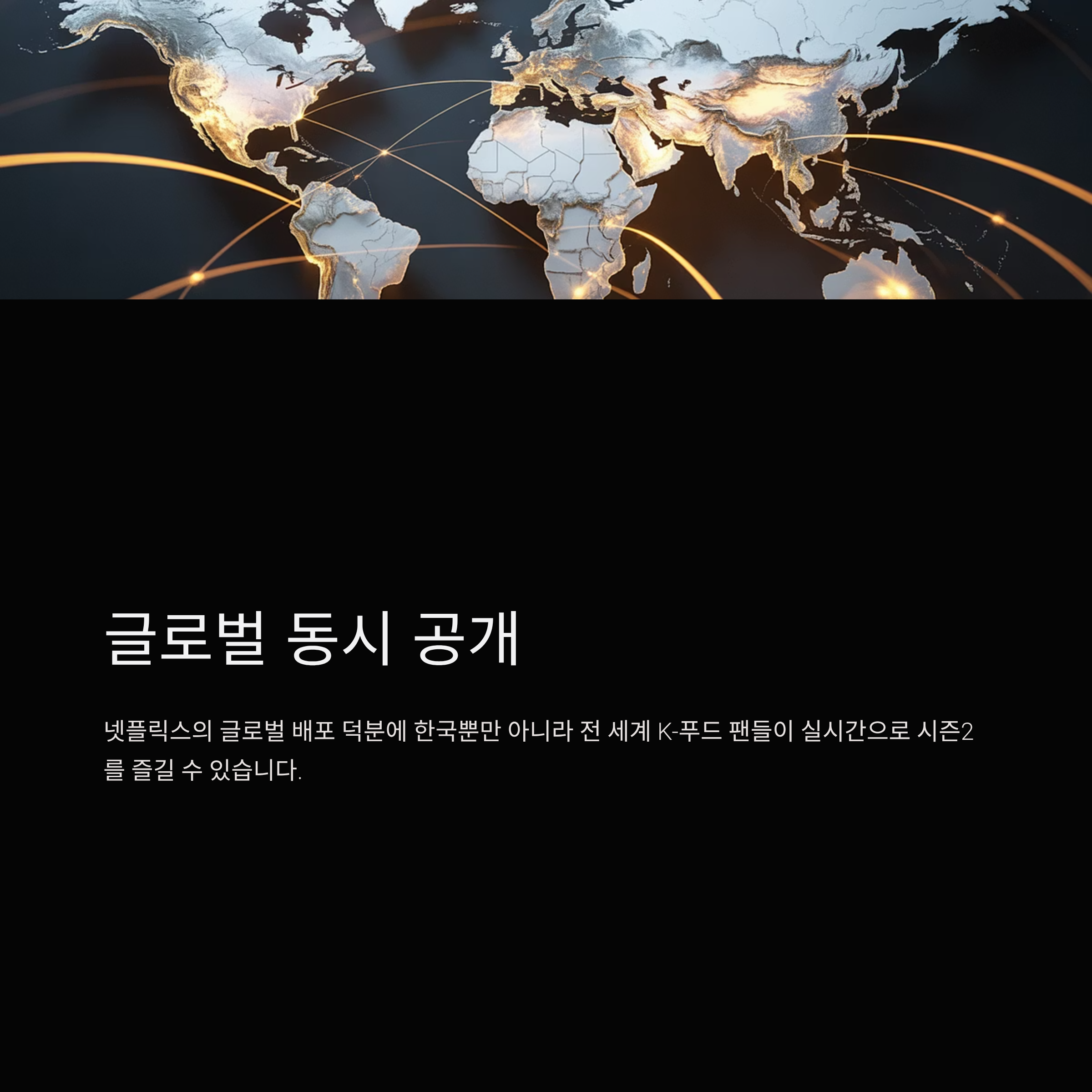 넷플릭스의 글로벌 배포 덕분에 한국뿐만 아니라 전 세계 K-푸드 팬들이 실시간으로 시즌2를 즐길 수 있습니다.
