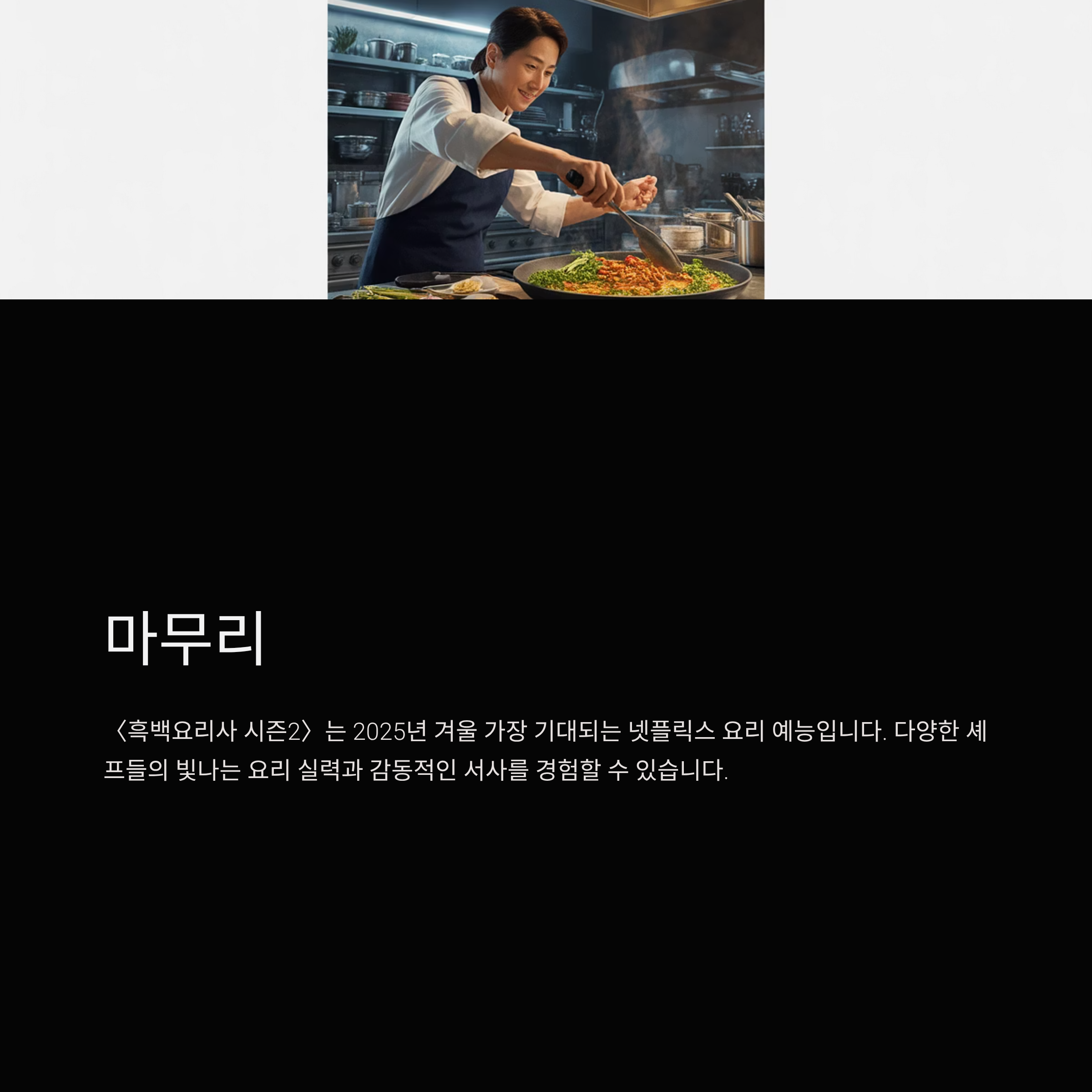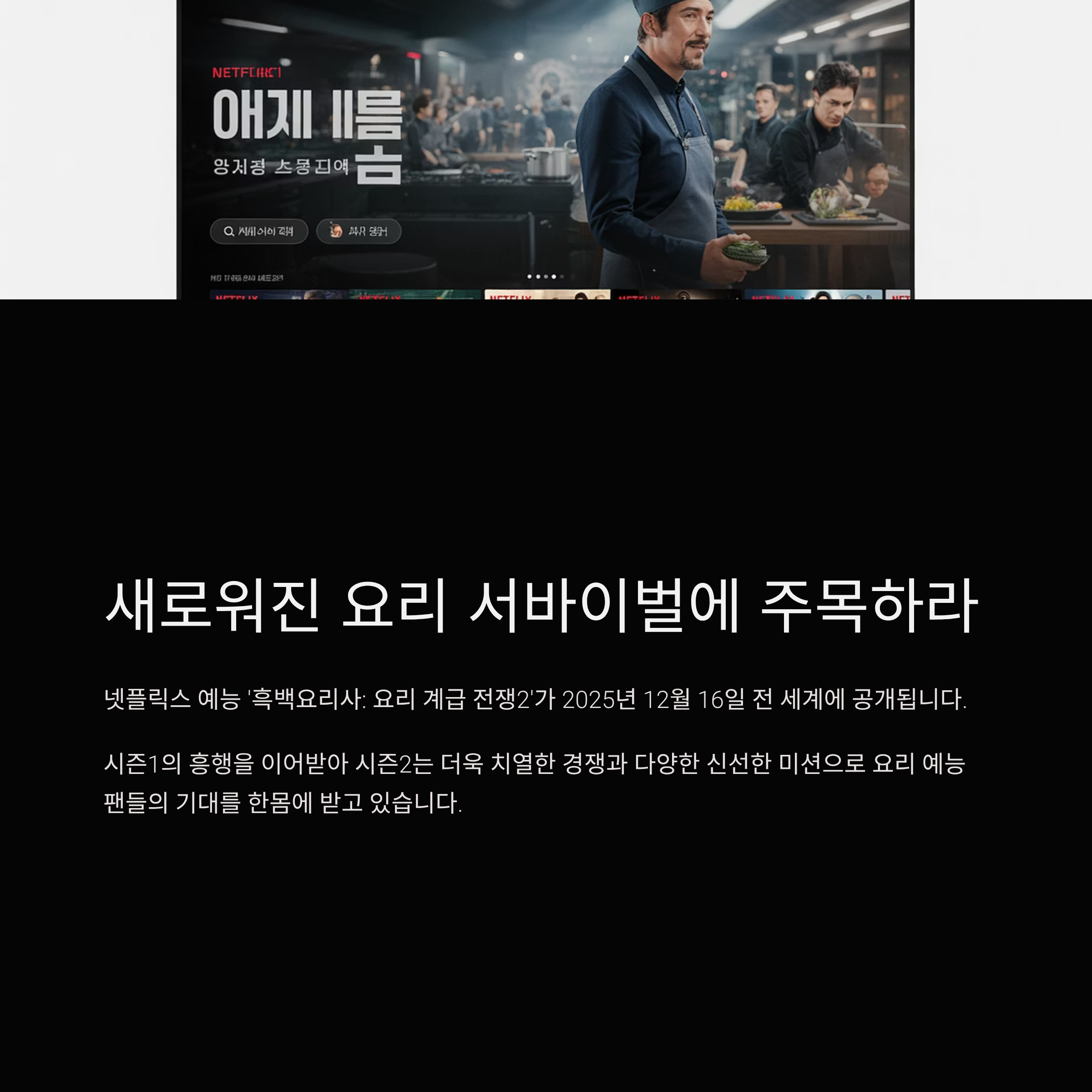 〈흑백요리사 시즌2〉는 2025년 겨울 가장 기대되는 넷플릭스 요리 예능입니다. 다양한 셰프들의 빛나는 요리 실력과 감동적인 서사를 경험할 수 있습니다.