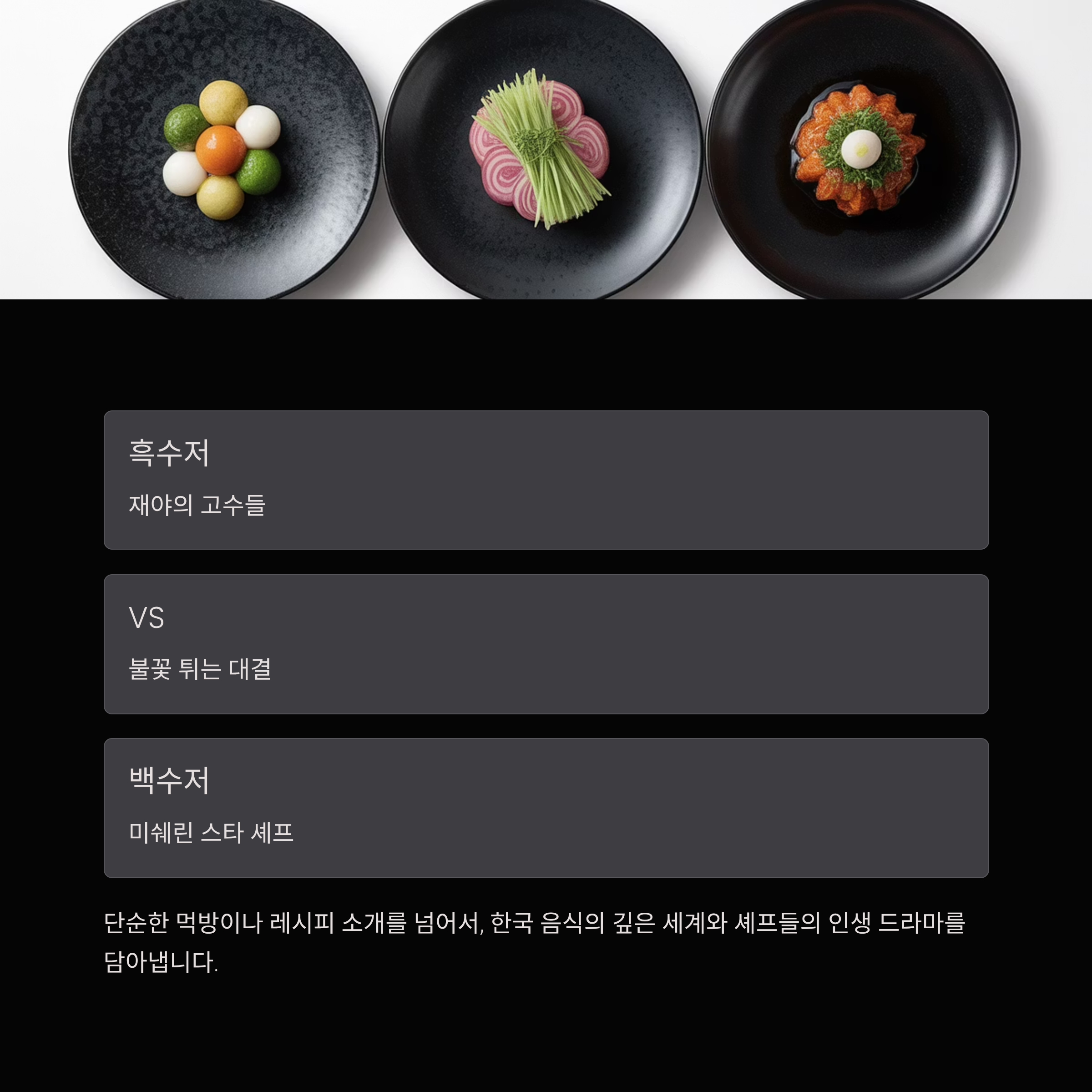 ‘흑수저’ 재야의 고수들과 미쉐린 ‘백수저’ 스타 셰프들이 펼치는 불꽃 튀는 요리 대결은 단순한 먹방이나 레시피 소개를 넘어서, 한국 음식의 깊은 세계와 셰프들의 인생 드라마를 담아냅니다.