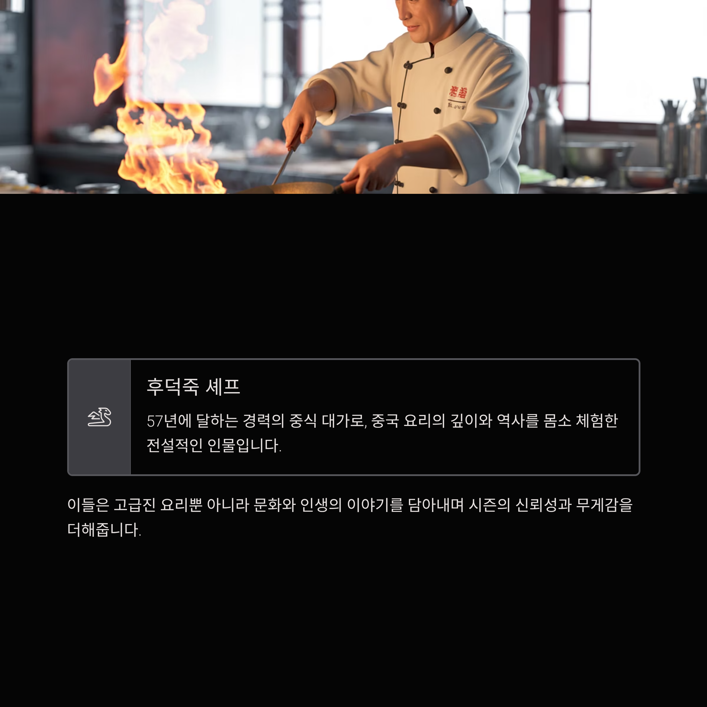 - 후덕죽 셰프 : 57년에 달하는 경력의 중식 대가로, 중국 요리의 깊이와 역사를 몸소 체험한 전설적인 인물입니다.