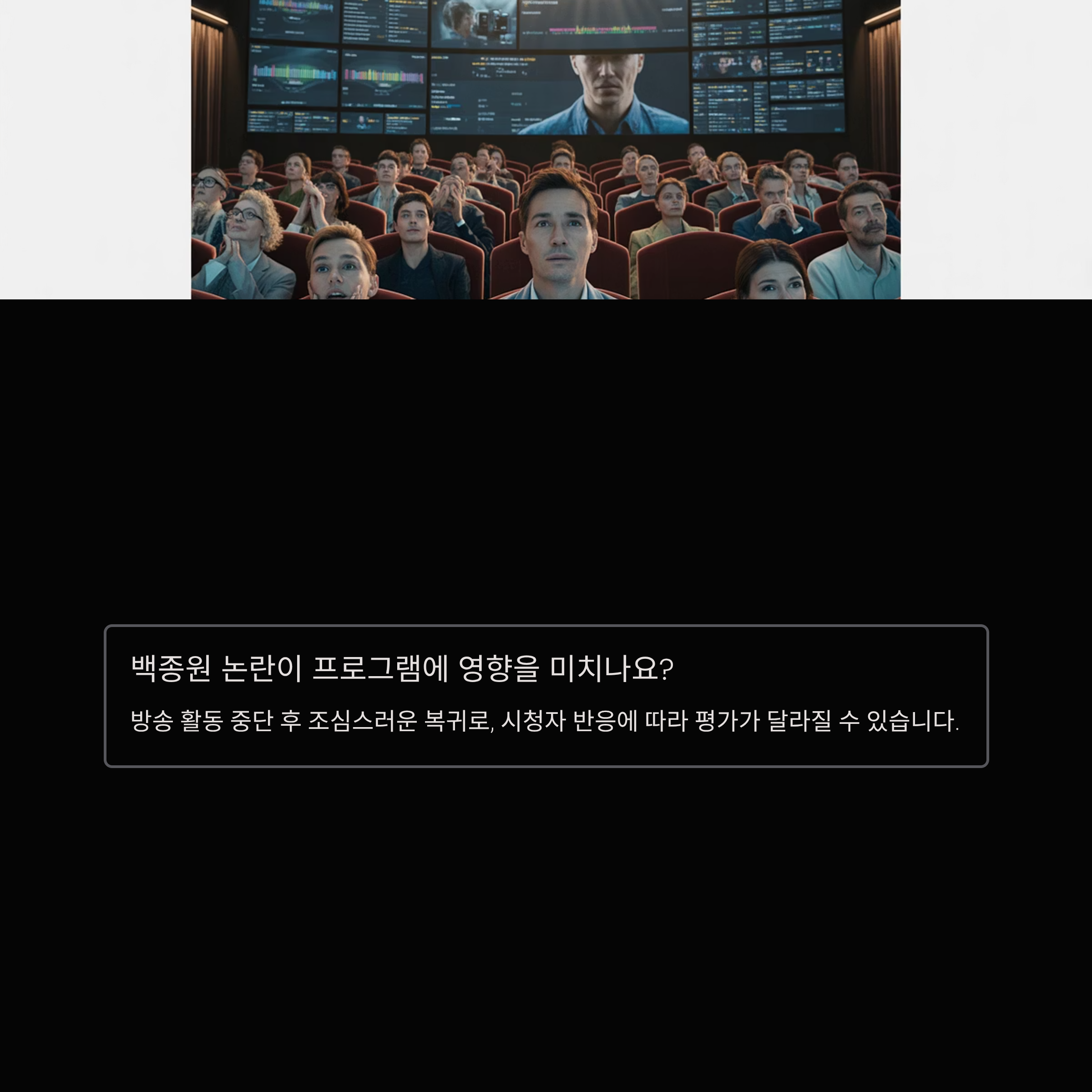 - 방송 활동 중단 후 조심스러운 복귀로, 시청자 반응에 따라 평가가 달라질 수 있습니다.