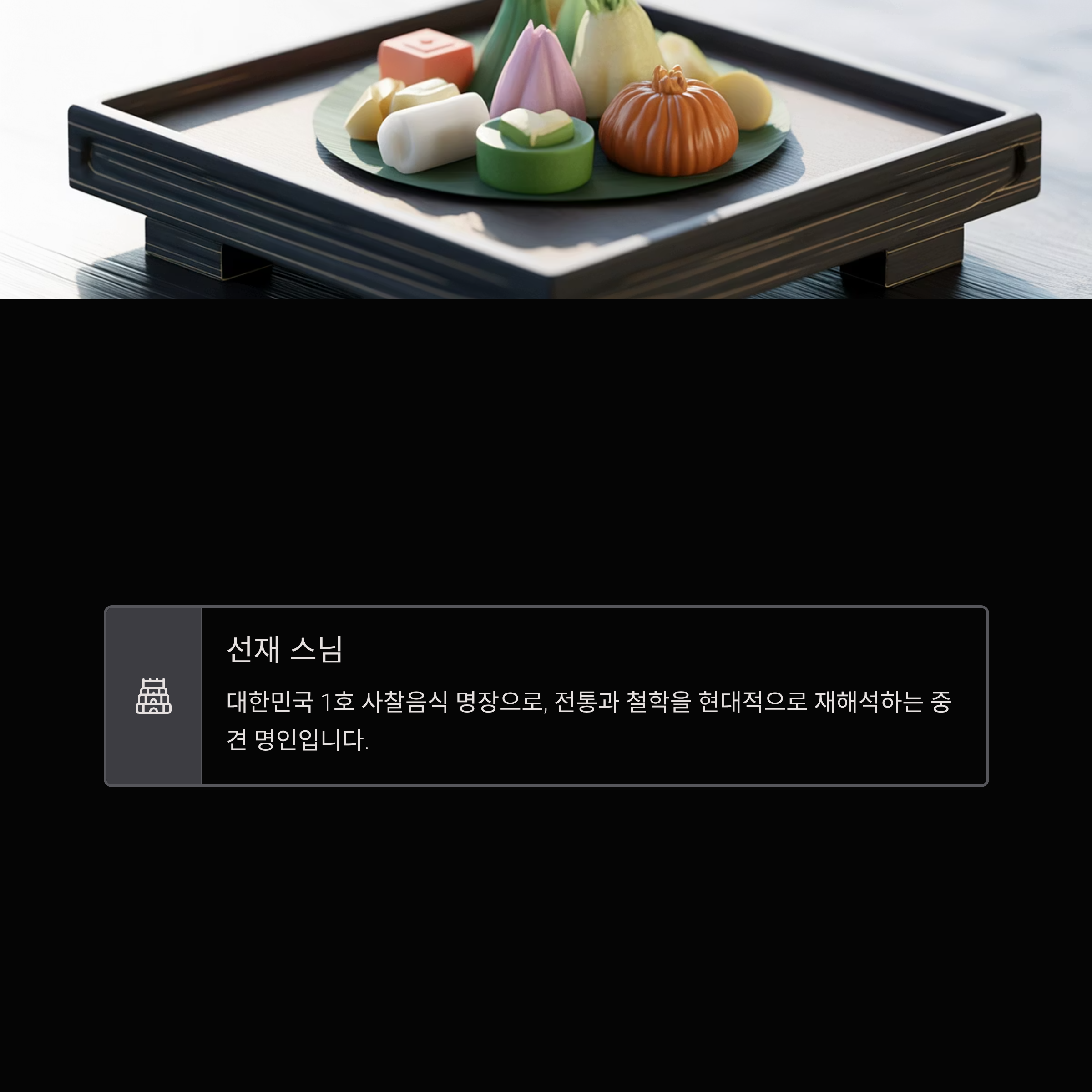 - 선재 스님 : 대한민국 1호 사찰음식 명장으로, 전통과 철학을 현대적으로 재해석하는 중견 명인입니다.