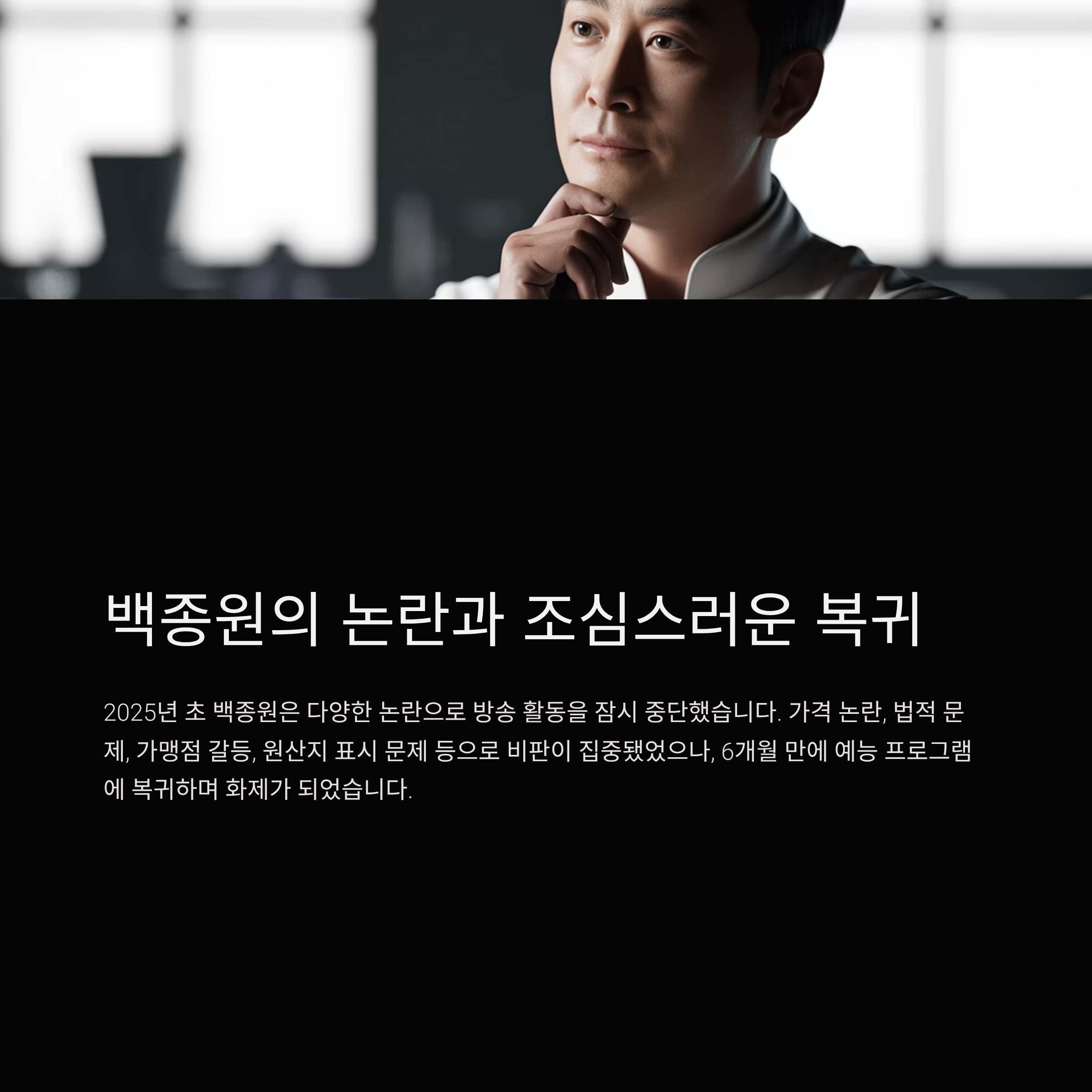2025년 초 백종원은 다양한 논란으로 방송 활동을 잠시 중단했습니다. 가격 논란, 법적 문제, 가맹점 갈등, 원산지 표시 문제 등으로 비판이 집중됐었으나, 6개월 만에 예능 프로그램에 복귀하며 화제가 되었습니다.