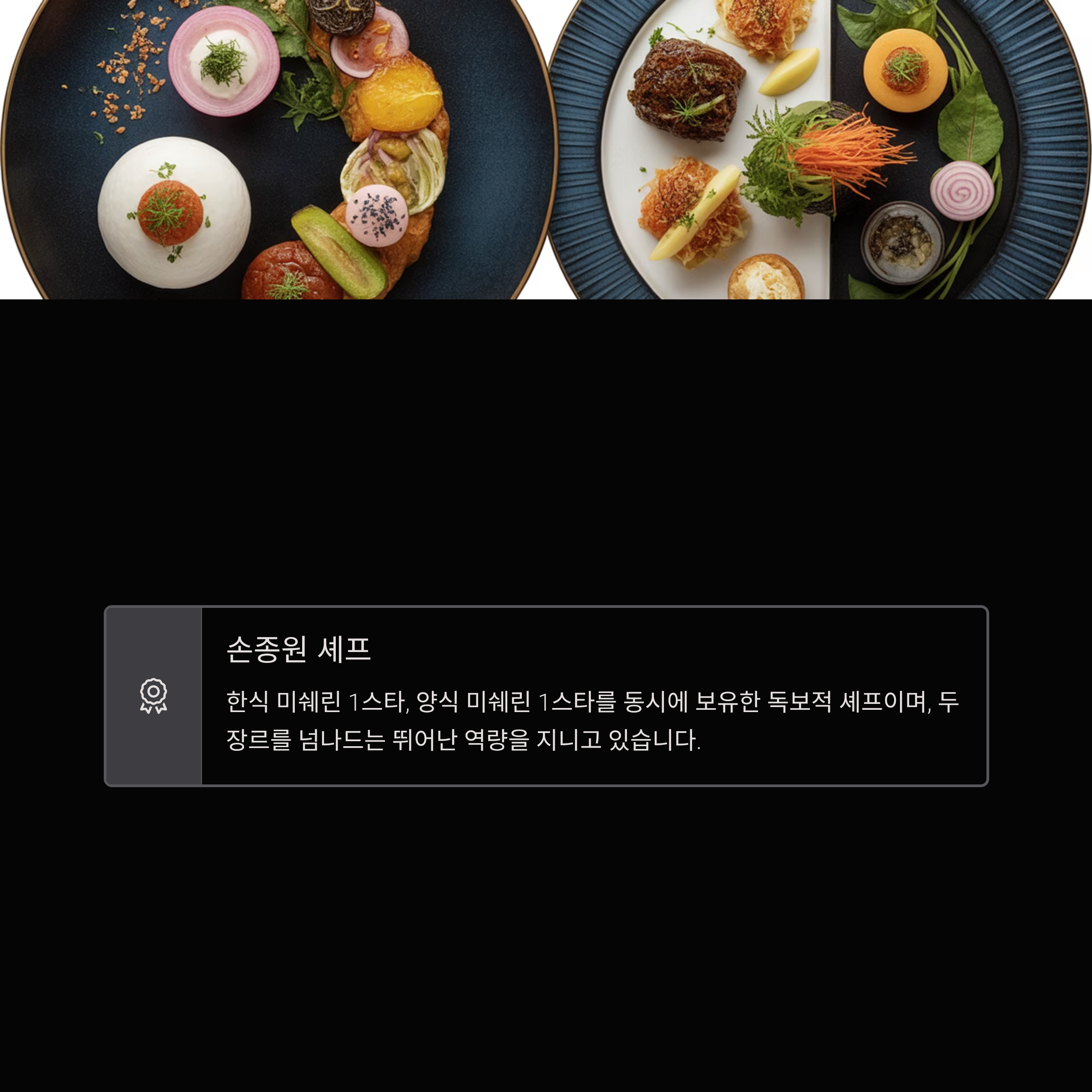 - 손종원 셰프 : 한식 미쉐린 1스타, 양식 미쉐린 1스타를 동시에 보유한 독보적 셰프이며, 두 장르를 넘나드는 뛰어난 역량을 지니고 있습니다.