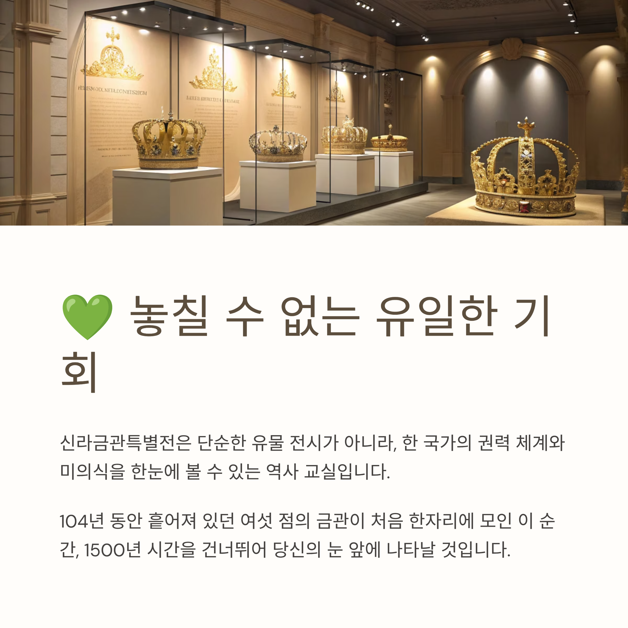 신라금관특별전은 단순한 유물 전시가 아니라, 한 국가의 권력 체계와 미의식을 한눈에 볼 수 있는 역사 교실입니다. 104년 동안 흩어져 있던 여섯 점의 금관이 처음 한자리에 모인 이 순간, 신라의 왕들과 왕비들이 착용했던 황금의 상징이 1500년 시간을 건너뛰어 당신의 눈 앞에 나타날 것입니다.