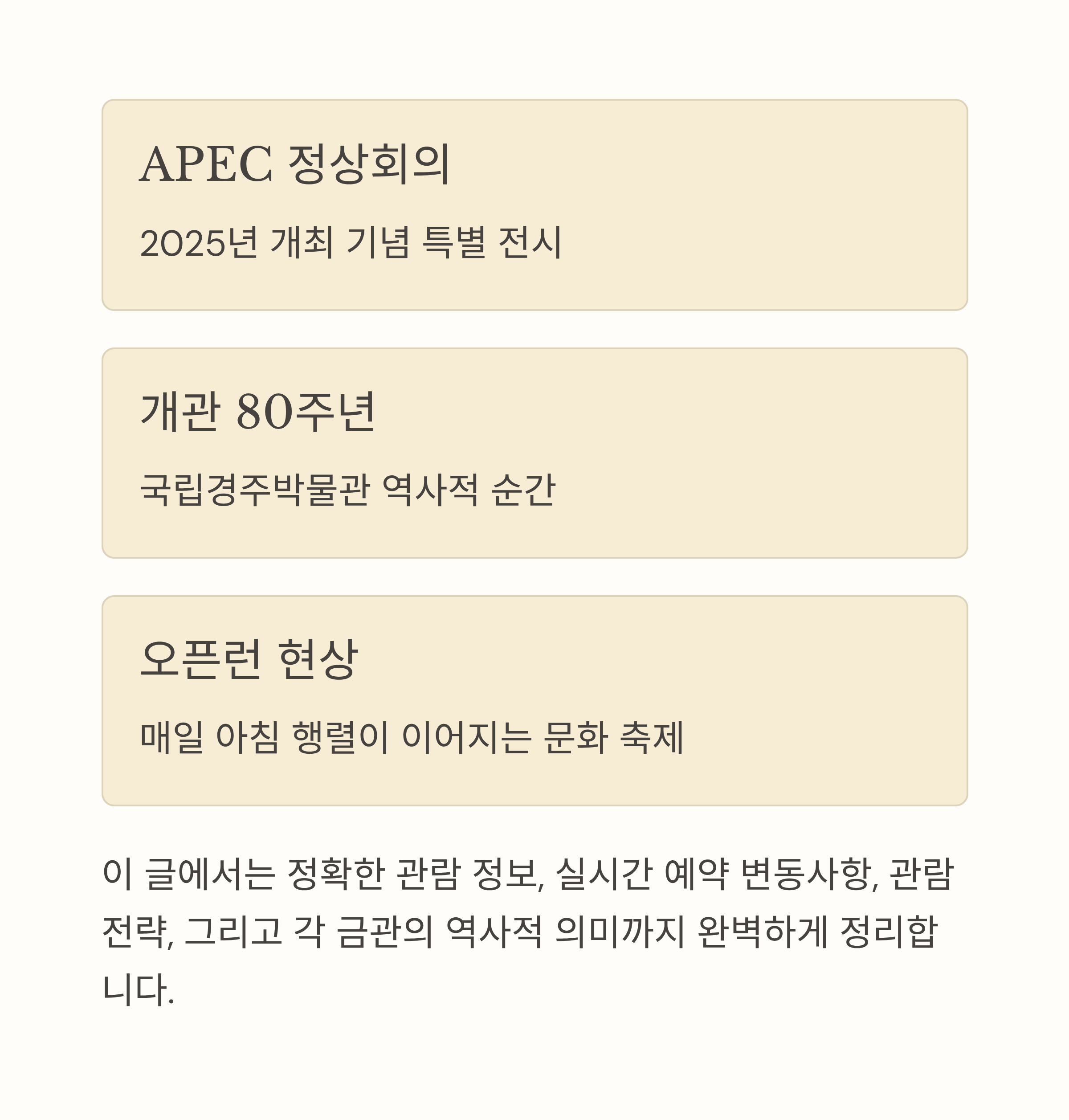 2025년 APEC 정상회의 개최와 국립경주박물관 개관 80주년이라는 특별한 시기에 기획된 이 전시는 개막 직후부터 매일 아침 오픈런 행렬이 이어지며 '이 시대의 문화 축제'로 평가받고 있습니다.