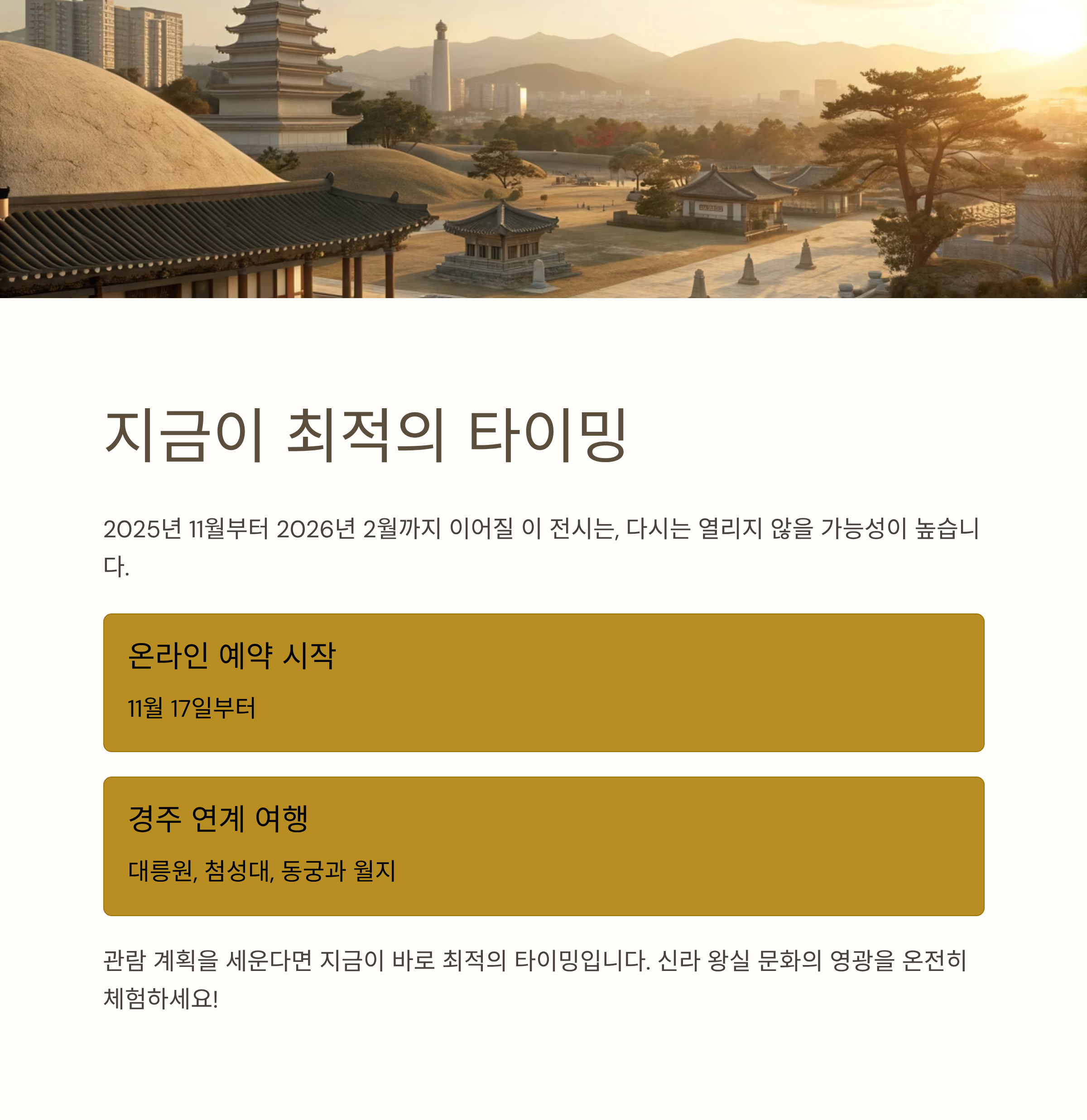 2025년 11월부터 2026년 2월까지 이어질 이 전시는, 다시는 열리지 않을 가능성이 높습니다. 온라인 예약 시스템이 17일부터 시작된 만큼, 관람 계획을 세운다면 지금이 바로 최적의 타이밍입니다. 경주 여행을 계획 중이라면 이 전시를 반드시 일정에 포함하세요. 대릉원, 첨성대, 동궁과 월지 등 경주의 다른 문화유산과 연계해 신라 왕실 문화의 영광을 온전히 체험할 수 있을 것입니다.