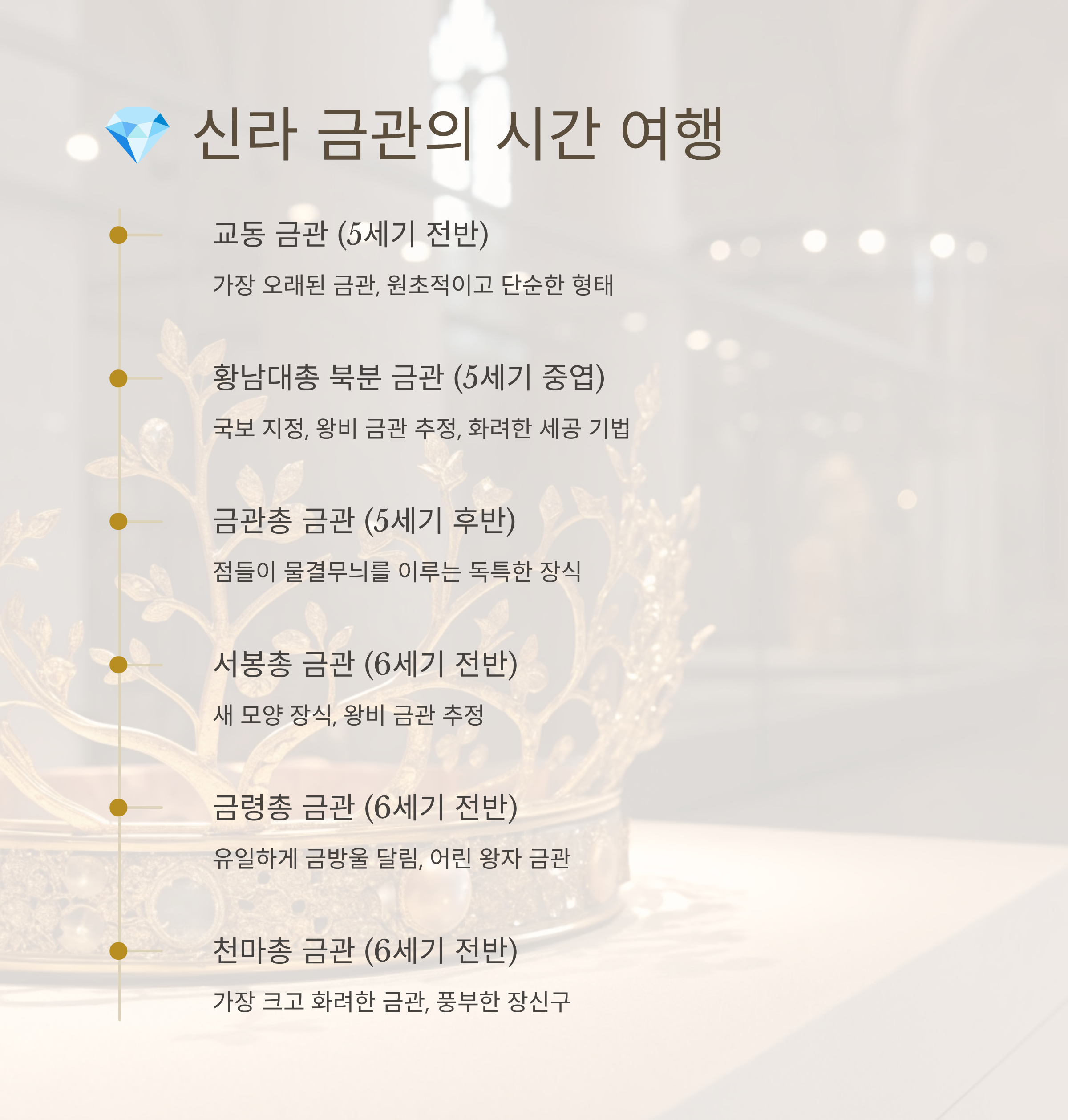 천마총 금관 (6세기 전반): 가장 크고 화려한 금관, 추가 장신구 풍부