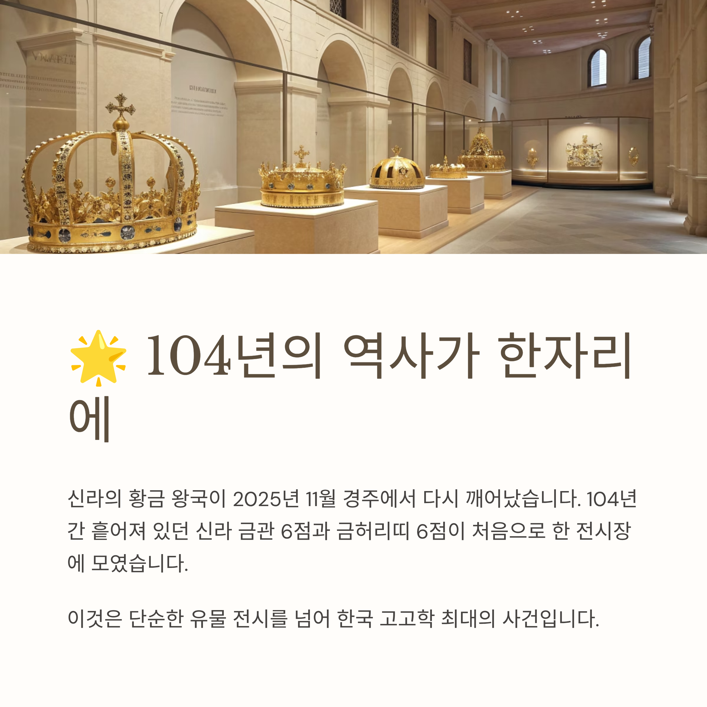 신라의 황금 왕국이 2025년 11월 경주에서 다시 깨어났습니다. 지난 104년간 서로 다른 박물관과 수장고에 흩어져 있던 신라 금관 6점과 금허리띠 6점이 처음으로 한 전시장에 모여들었습니다. 이것은 단순한 유물 전시를 넘어 한국 고고학 최대의 사건입니다.