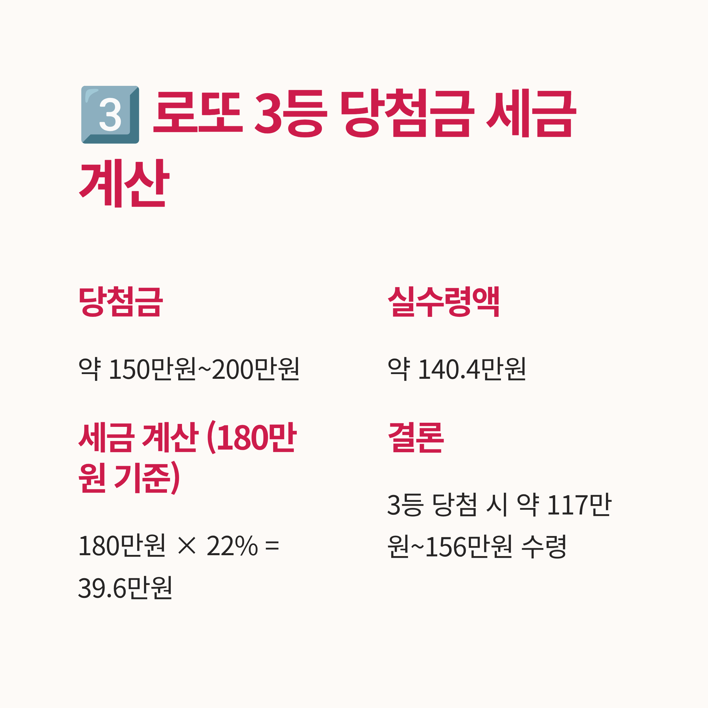 결론: 3등 당첨 시 약 117만원~156만원 수령 (세금 약 22%)