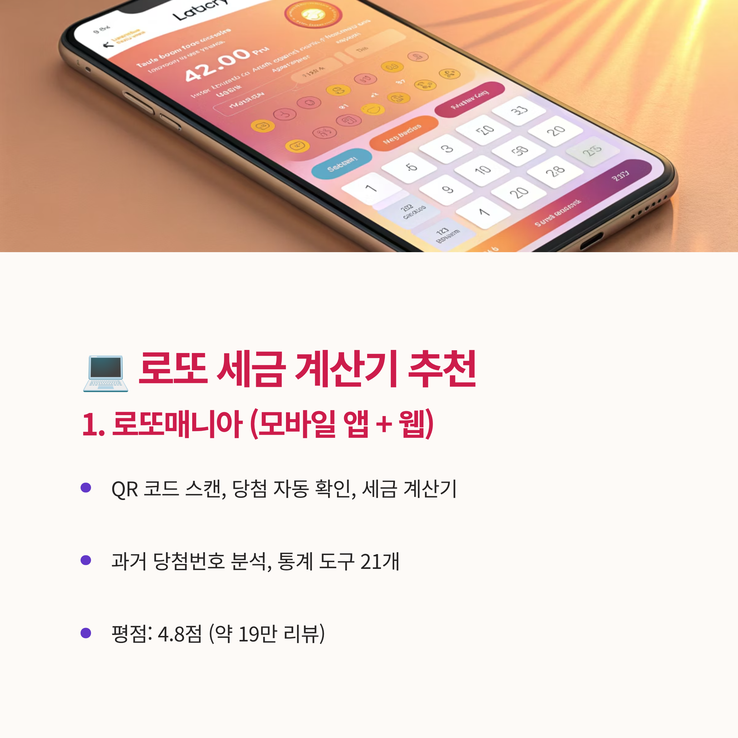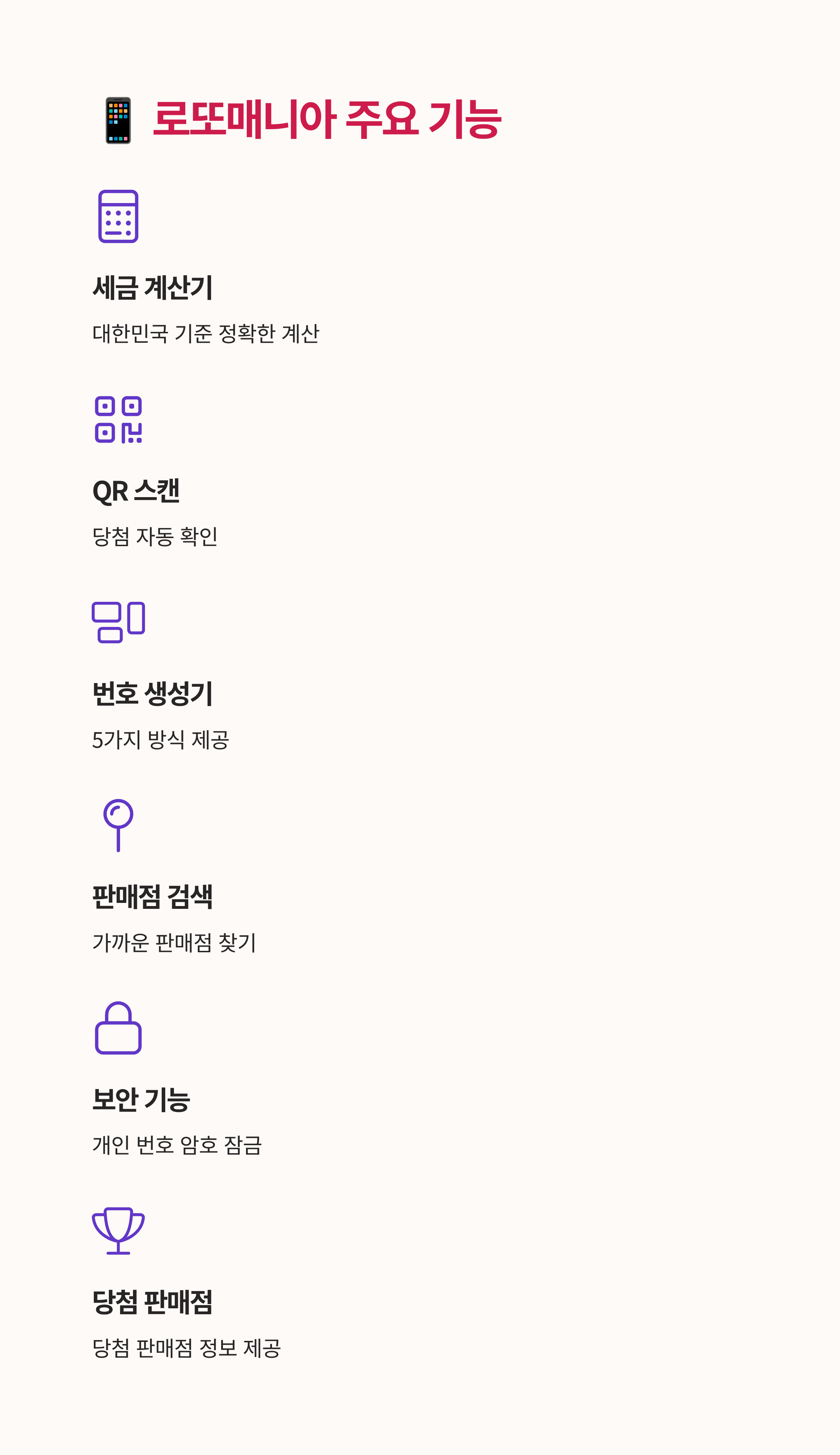 - 특징: QR 코드 스캔, 당첨 자동 확인, 세금 계산기