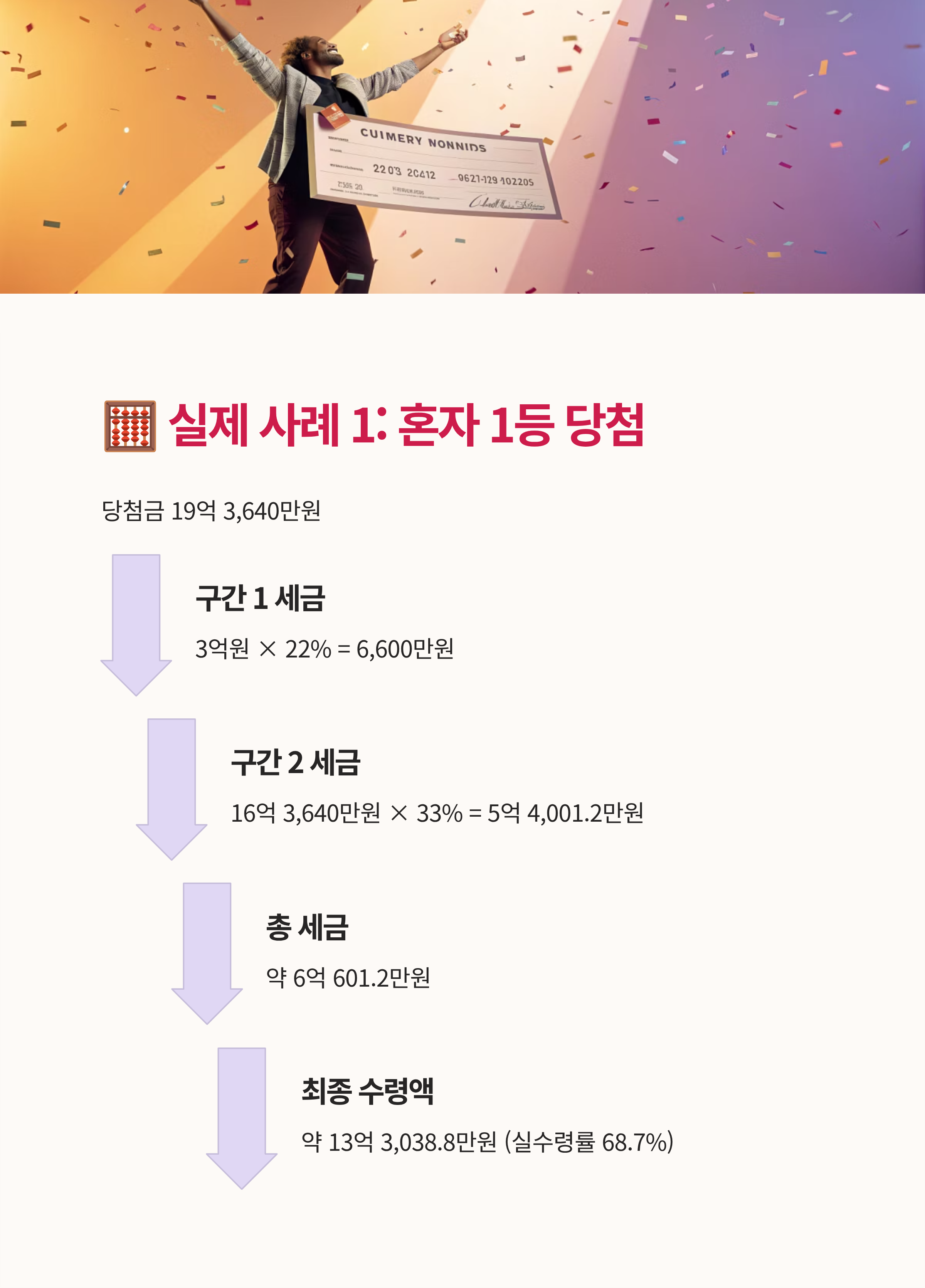 결론: 20억 당첨 시 약 13억 7천만원 수령 (세금 약 31%)