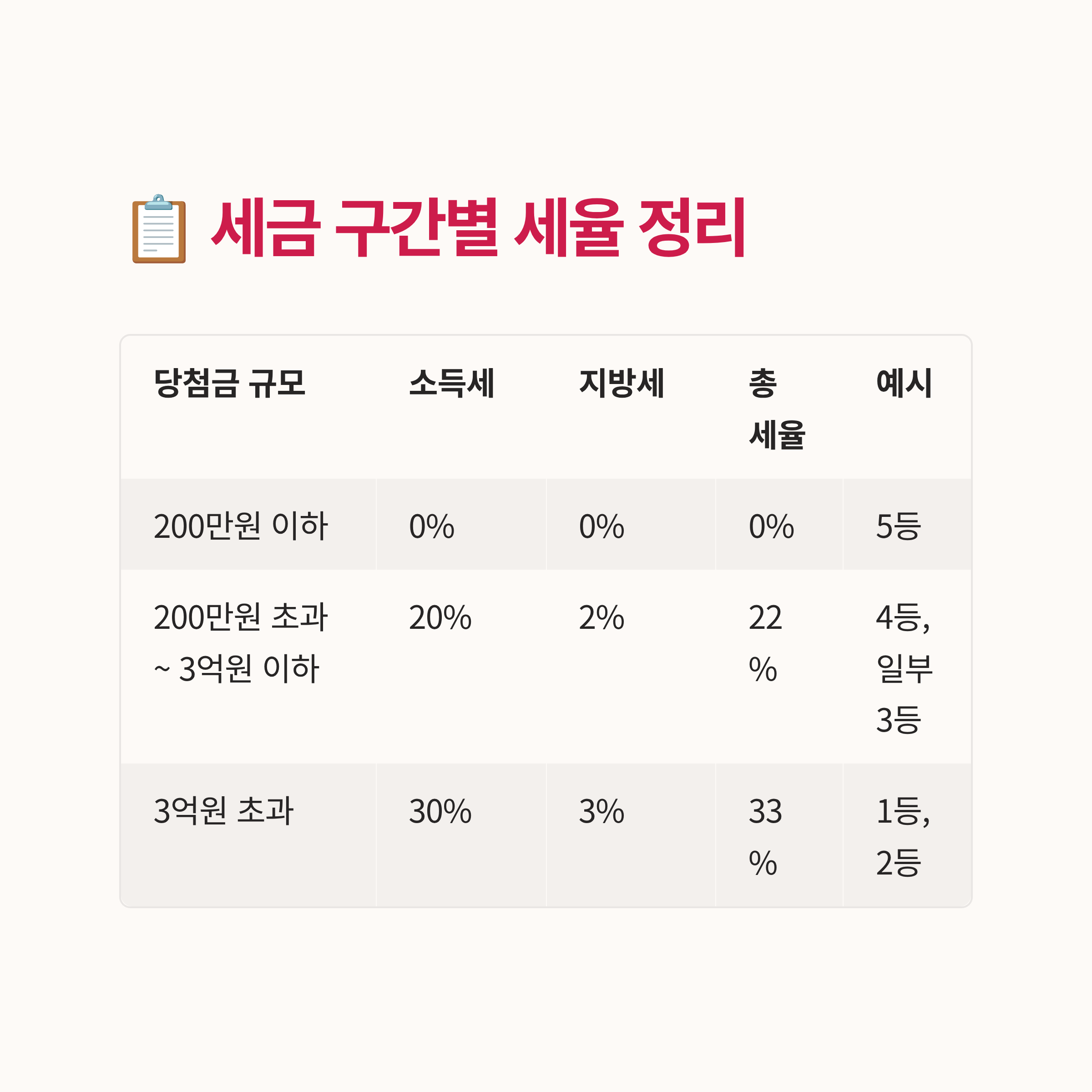 - 3억원 초과: 33% 세율 적용 (1등, 2등 대부분 해당)