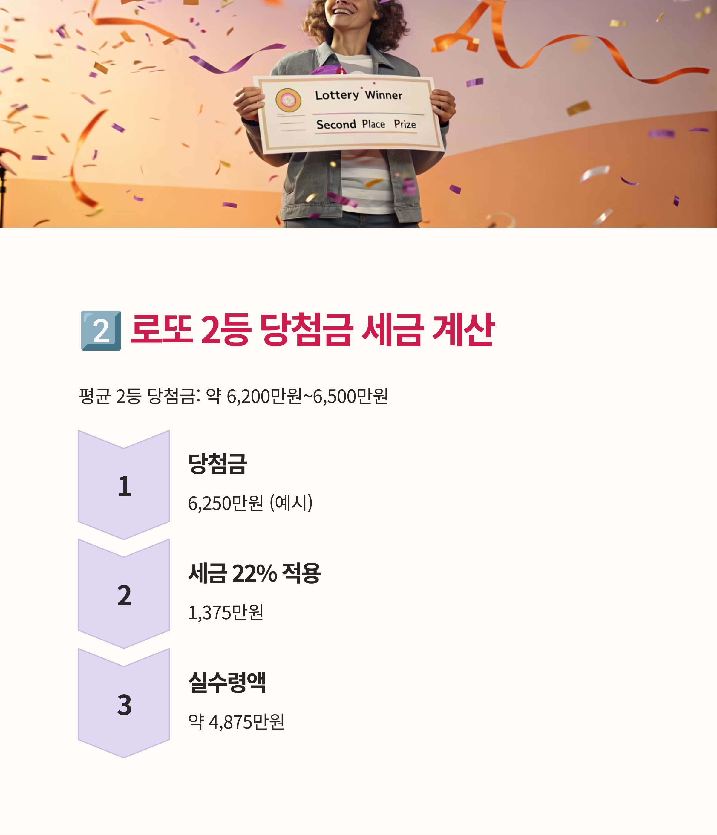 결론: 2등 당첨 시 약 3,900만원~5,100만원 수령 (세금 약 22%)