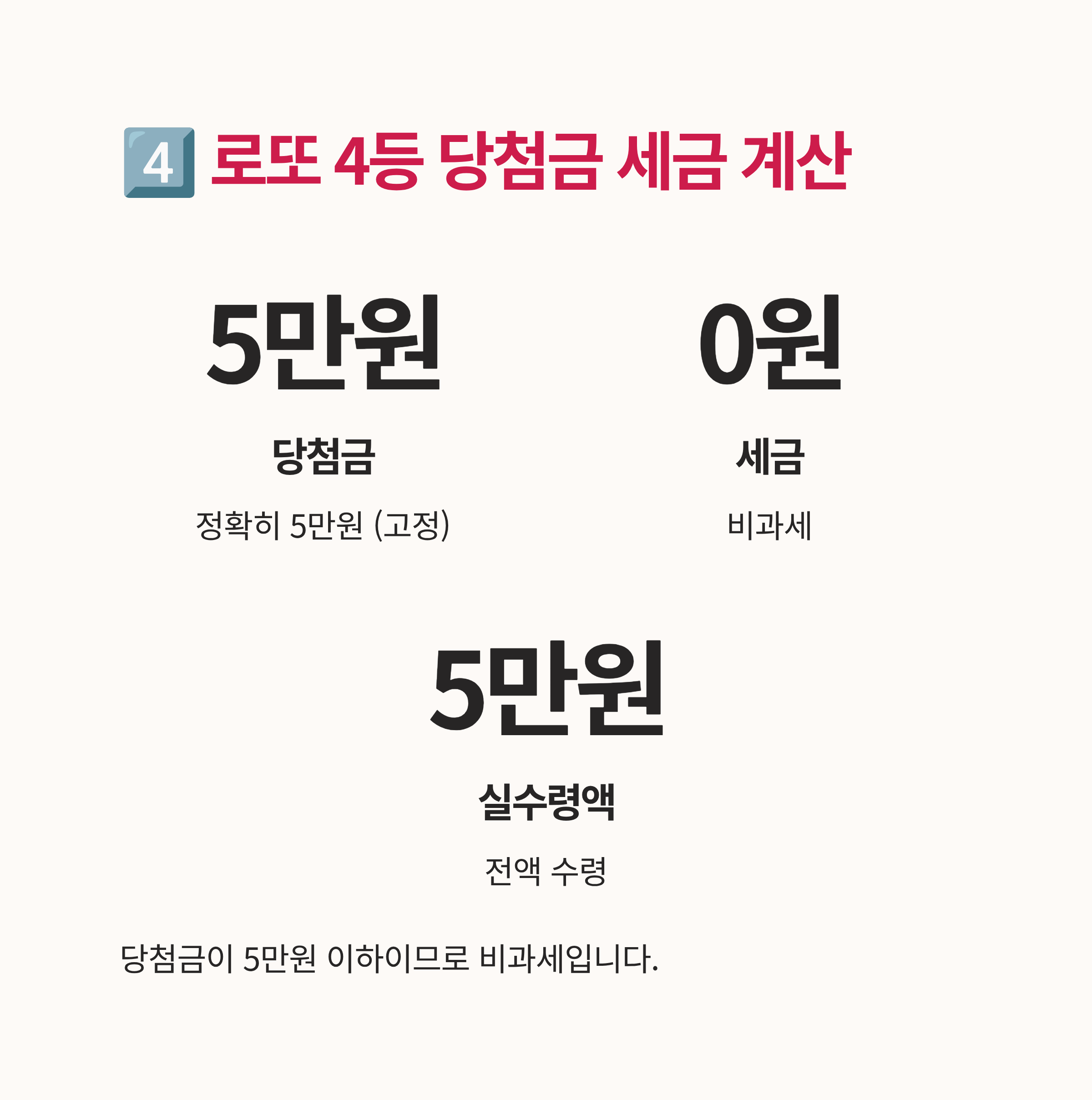 결론: 4등 당첨 시 5만원 전액 수령 (세금 0%)