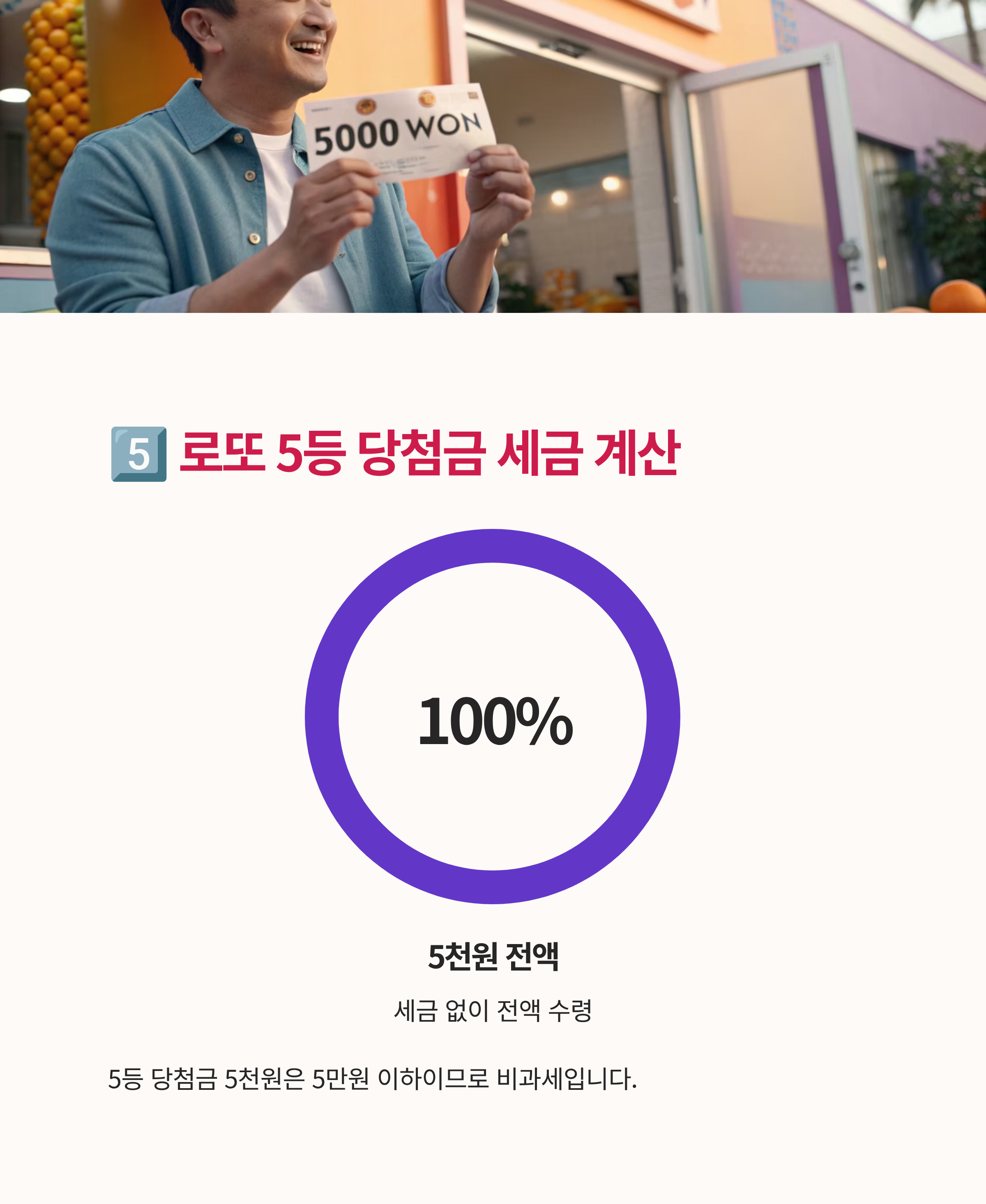 결론: 5등 당첨 시 5천원 전액 수령 (세금 0%)