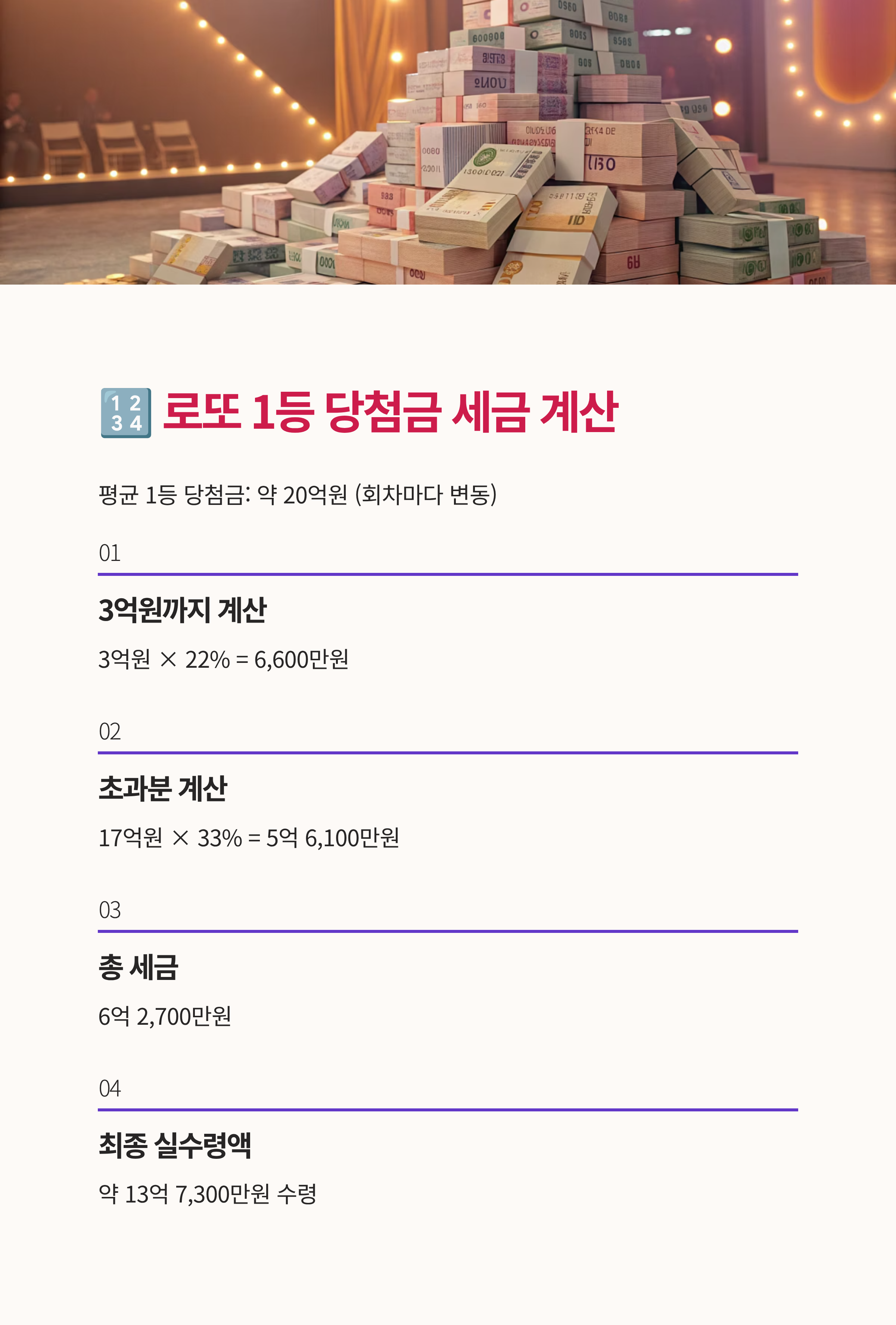 로또 당첨은 분명 기쁜 일이지만, 현실은 세금입니다. 1등 당첨금의 30~33%가 세금으로 빠지는 현실을 미리 이해하면, 당첨 후 심리적 충격을 줄일 수 있습니다.