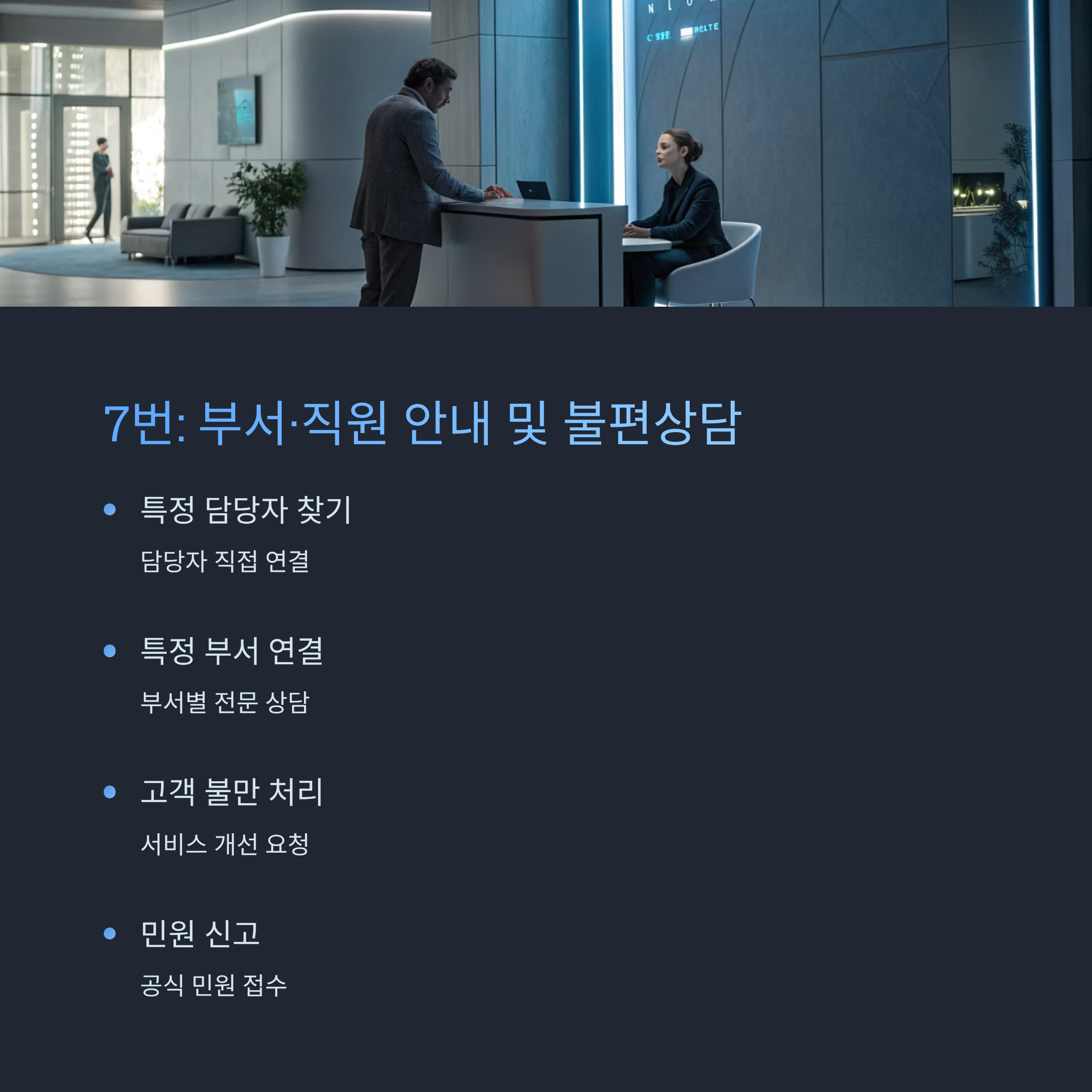 이용 사항: - 특정 담당자 찾기 - 특정 부서 연결 - 고객 불만 처리 - 민원 신고