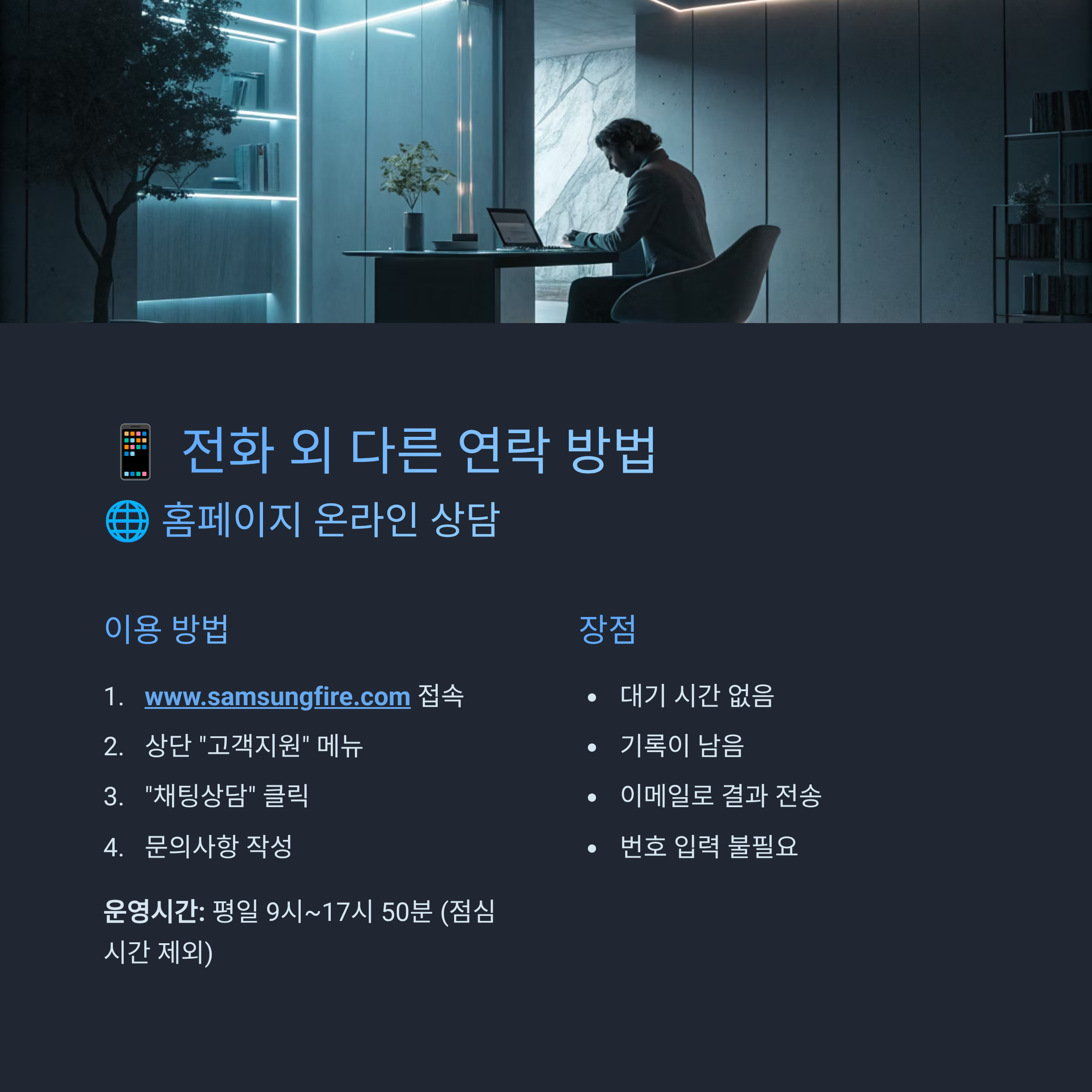 이용 방법: - www.samsungfire.com 접속 - 상단 "고객지원" 메뉴 - "채팅상담" 또는 "상담신청" 클릭 - 문의사항 작성 운영시간: - 평일 9시~17시 50분 - 토요일, 공휴일 휴무 - 점심시간 (12시 20분~13시 30분) 제외 장점: - 대기 시간 없음 - 기록이 남음 - 이메일로 결과 전송 - 번호 입력 불필요