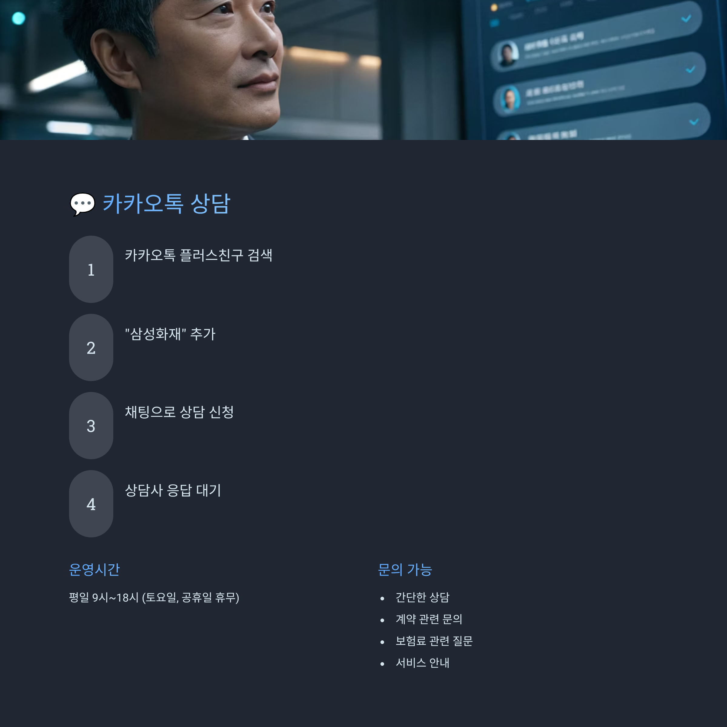 이용 방법: - 카카오톡 플러스친구 검색 - "삼성화재" 또는 "삼성화재고객센터" 추가 - 채팅으로 상담 신청 - 상담사가 응답할 때까지 대기 운영시간: - 평일 9시~18시 - 토요일, 공휴일 휴무 문의 가능: - 간단한 상담 - 계약 관련 문의 - 보험료 관련 질문 - 서비스 안내
