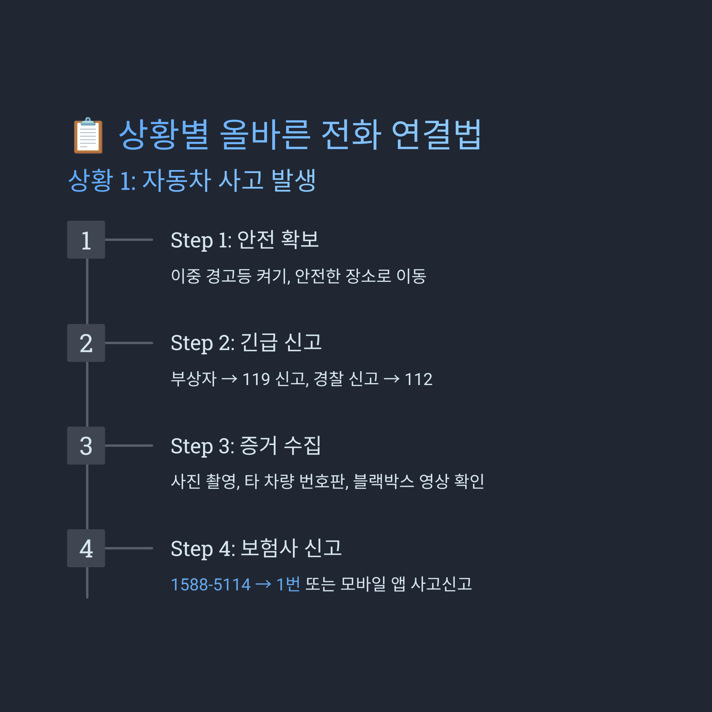사고 발생 직후 대처법: - 안전한 장소로 이동 - 타 차량 안전 확보 - 부상자 확인 후 119 신고 - 경찰 신고 (112) - 증거사진/영상 촬영 - 1588-5114 누르고 "1" 누르기 상담사 안내 내용: - 정확한 사고 위치 확인 - 피해 규모 파악 - 과실 여부 초기 판단 - 출동기사 배정 - 수리소 정보 제공