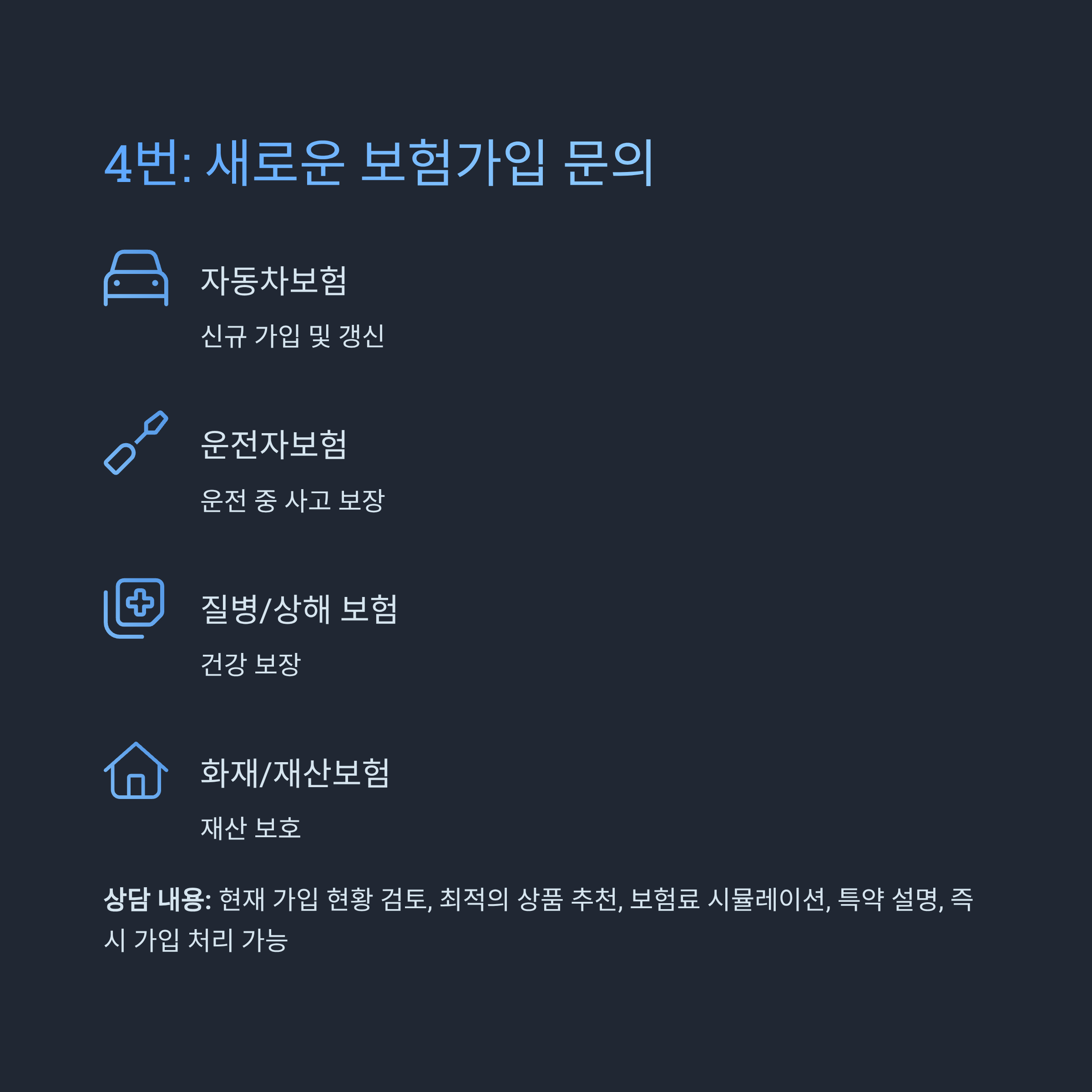 상담 가능 상품: - 자동차보험 신규 가입 - 자동차보험 갱신 - 운전자보험 - 질병/상해 보험 - 화재/재산보험 상담 내용: - 현재 가입 현황 검토 - 최적의 상품 추천 - 보험료 시뮬레이션 - 특약 설명 - 즉시 가입 처리 가능