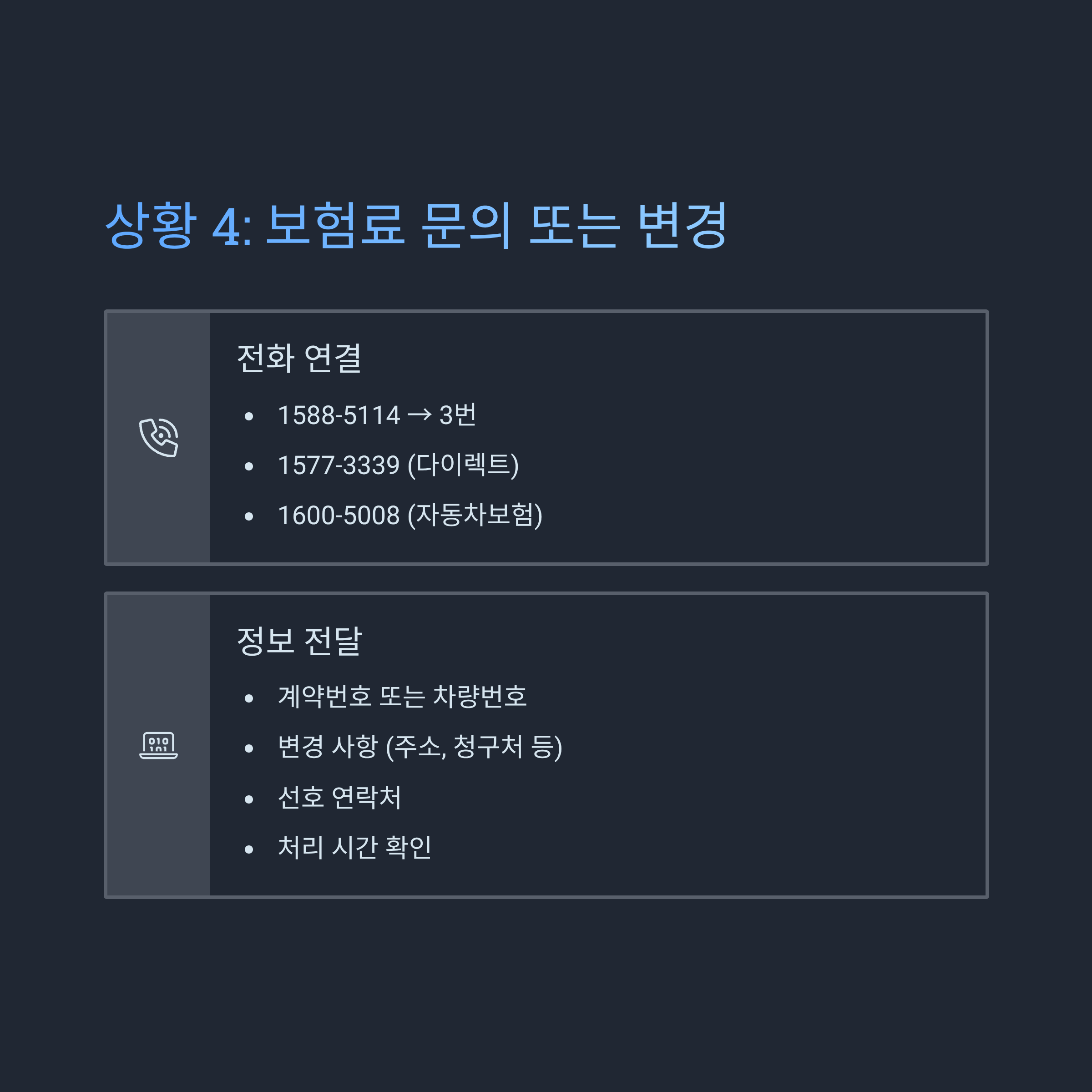 전화: 1588-5114 → 3번 (계약조회/변경) 또는 - 1577-3339 (다이렉트 상담) - 1600-5008 (자동차보험 전화가입) 정보 전달: - 계약번호 또는 차량번호 - 변경 사항 (주소, 청구처 등) - 선호 연락처 - 처리 시간 확인