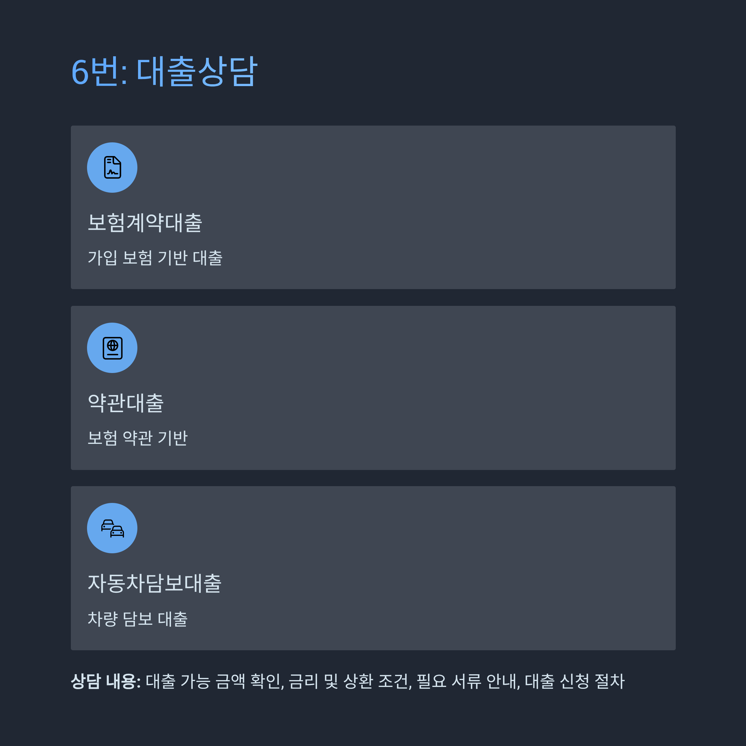 상품 종류: - 보험계약대출 - 약관대출 - 자동차담보대출 상담 내용: - 대출 가능 금액 확인 - 금리 및 상환 조건 - 필요 서류 안내 - 대출 신청 절차