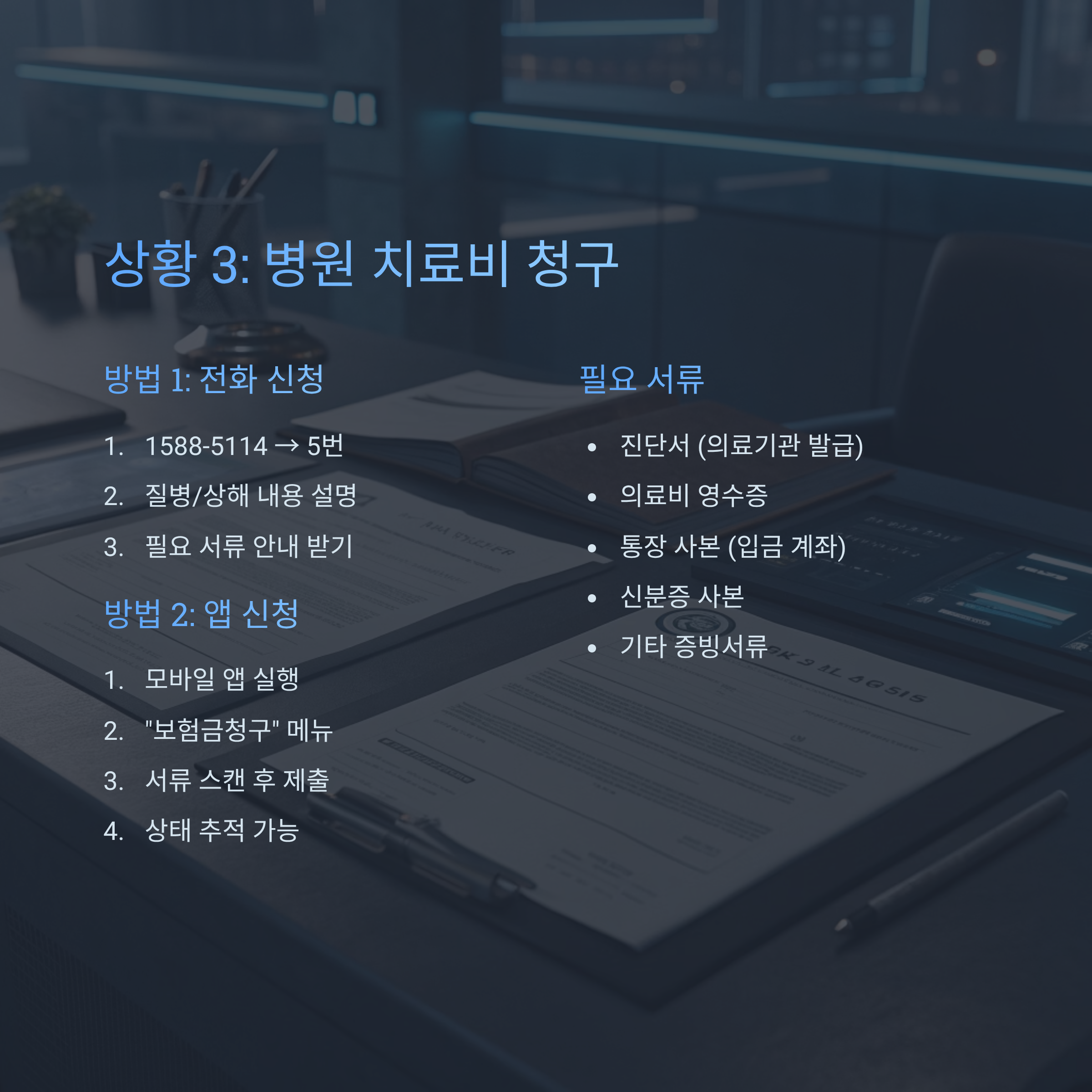 방법 1: 전화 신청 - 1588-5114 → 5번 (보험금 청구) - 상담사에게 질병/상해 내용 설명 - 필요 서류 안내 받기 방법 2: 앱 신청 - 모바일 앱 실행 - "보험금청구" 메뉴 - 서류 스캔 후 제출 - 상태 추적 가능 필요 서류: - 진단서 (의료기관 발급) - 의료비 영수증 - 통장 사본 (입금 계좌) - 신분증 사본 - 기타 증빙서류