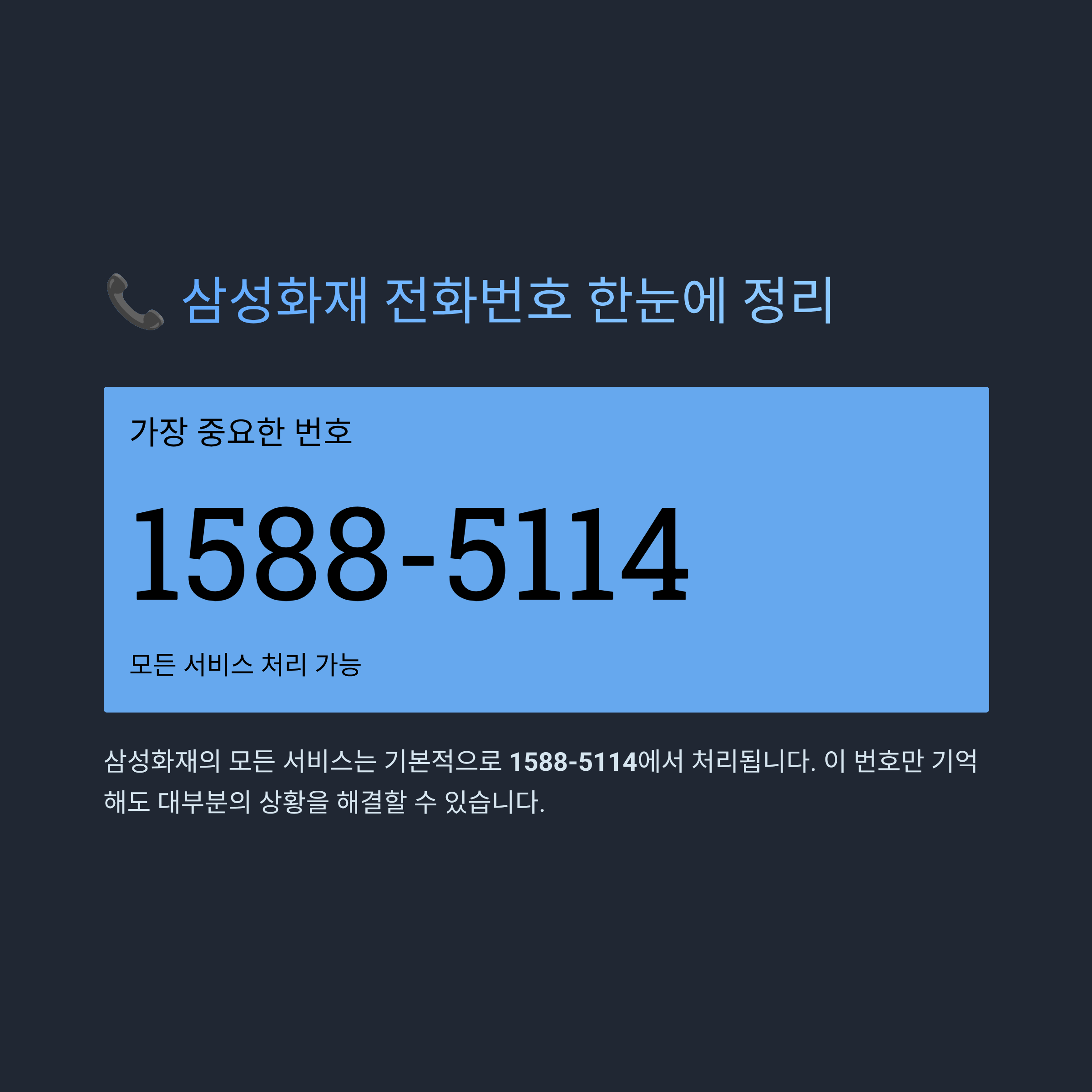 삼성화재의 모든 서비스는 기본적으로 1588-5114에서 처리됩니다. 이 번호만 기억해도 대부분의 상황을 해결할 수 있습니다.