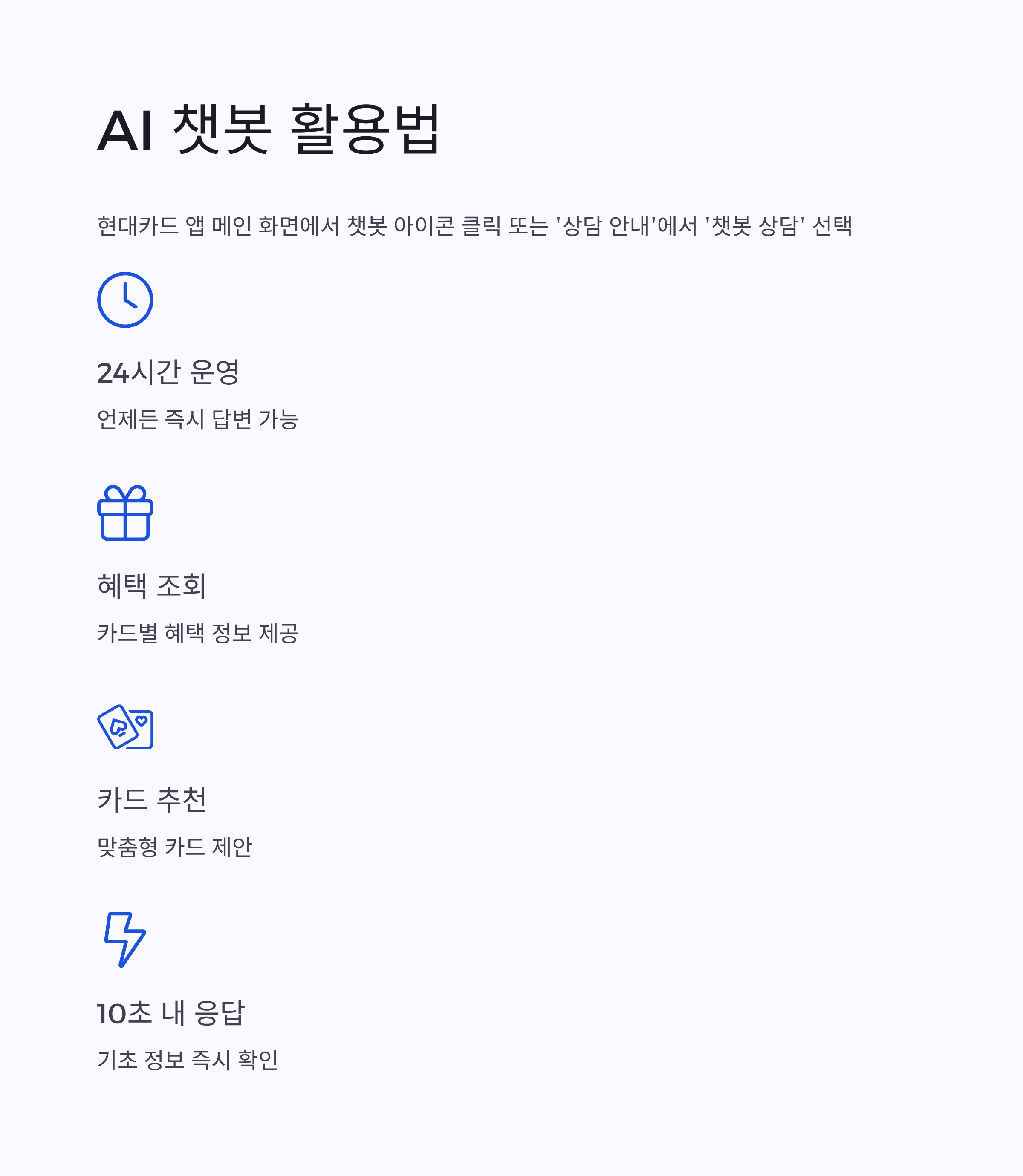 AI 챗봇도 항상 대기 중입니다. 현대카드 앱의 메인 화면에서 챗봇 아이콘을 클릭하거나 '상담 안내'에서 '챗봇 상담'을 선택하면 됩니다. 이 챗봇은 24시간 운영되며, 간단한 카드 혜택 조회, 맞춤 카드 추천, 기본 이용 안내 등을 즉시 제공받을 수 있습니다. 상담원 연결 없이도 대부분의 기초 정보는 10초 내에 얻을 수 있습니다.