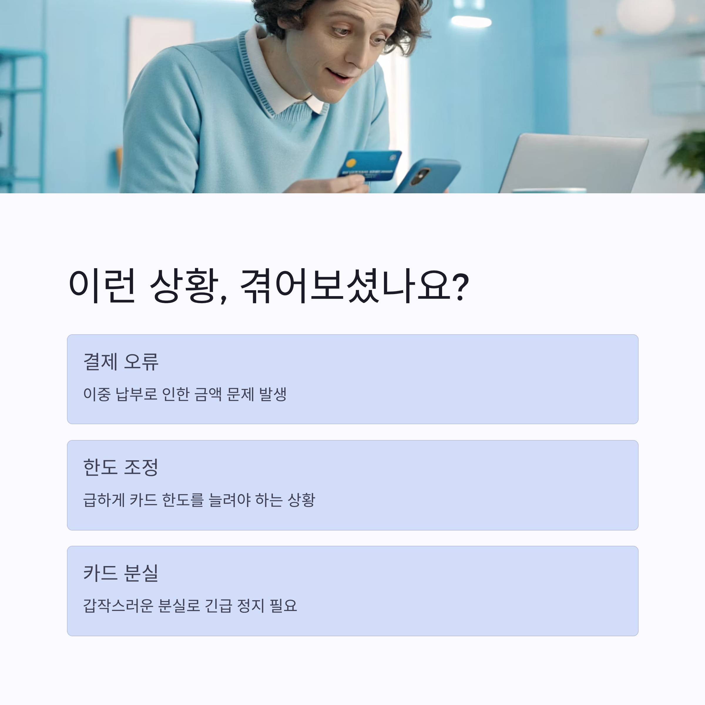 카드를 사용하면서 요금 문제가 생기거나, 한도 조정이 필요하거나, 또는 갑자기 카드가 분실되는 상황이 발생할 수 있습니다.