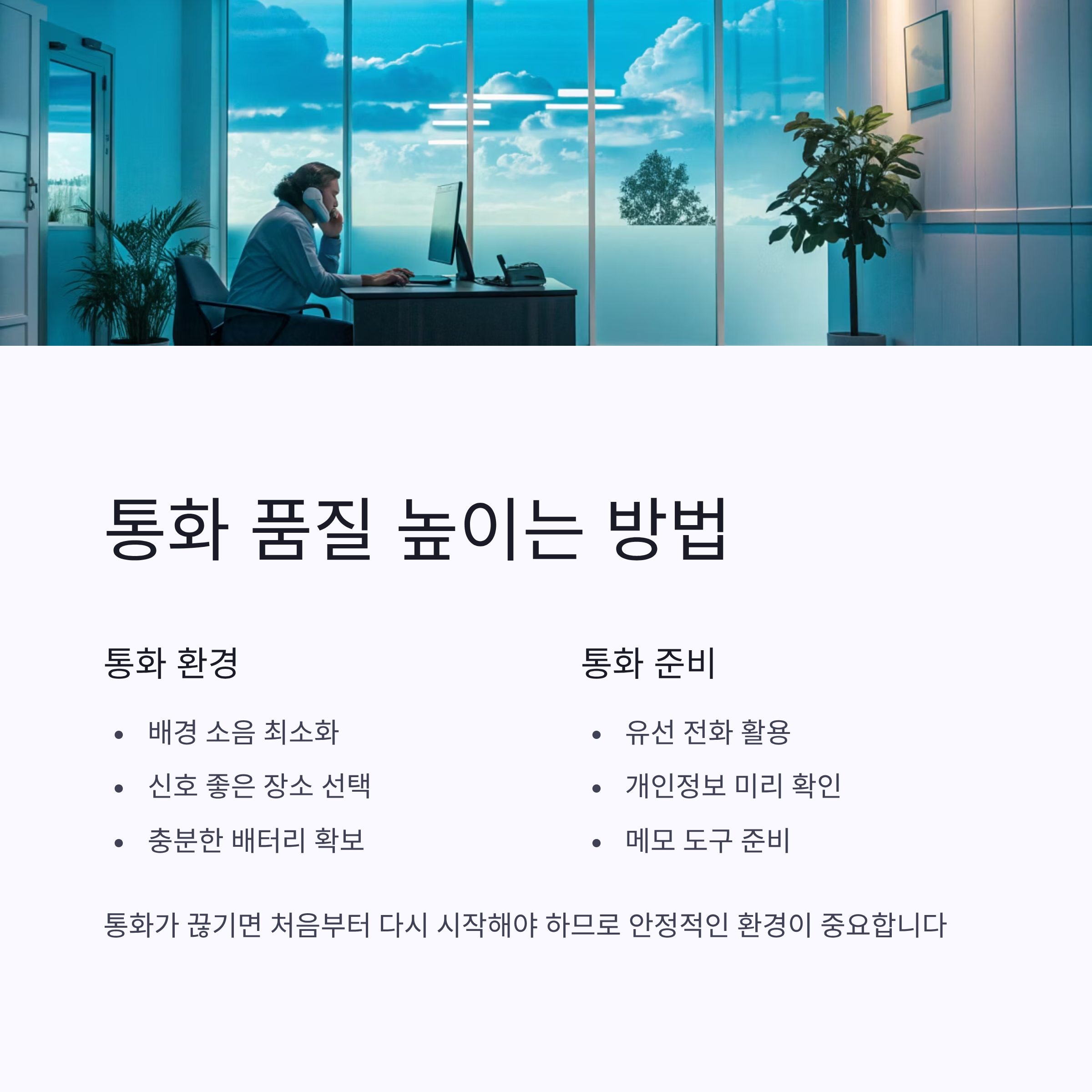 통화 중 개인정보를 말할 때는 배경 소음을 최소화하고, 충분한 배터리가 있는 상태에서 시작하세요. 통화가 끊기는 일을 방지하려면 유선 전화를 이용하거나 휴대폰이 신호 잘 받는 장소에서 통화하는 것이 좋습니다. 상담 중 성명, 생년월일, 개인정보 확인 요청이 많으므로 미리 준비해두면 더욱 빠릅니다.