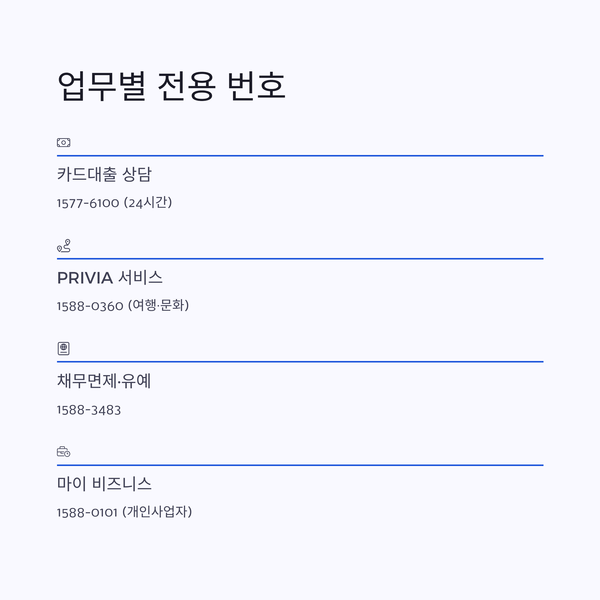 장기 또는 단기 카드대출과 관련된 상담은 1577-6100번입니다. 역시 365일 24시간 운영되므로 금융 상황이 급할 때 언제든 상담 받을 수 있습니다. 여행, 쇼핑, 교육, 문화, 레저 관련 PRIVIA 서비스 문의는 1588-0360번이며, 채무면제나 유예 서비스가 필요한 경우는 1588-3483번으로 연락하면 됩니다.