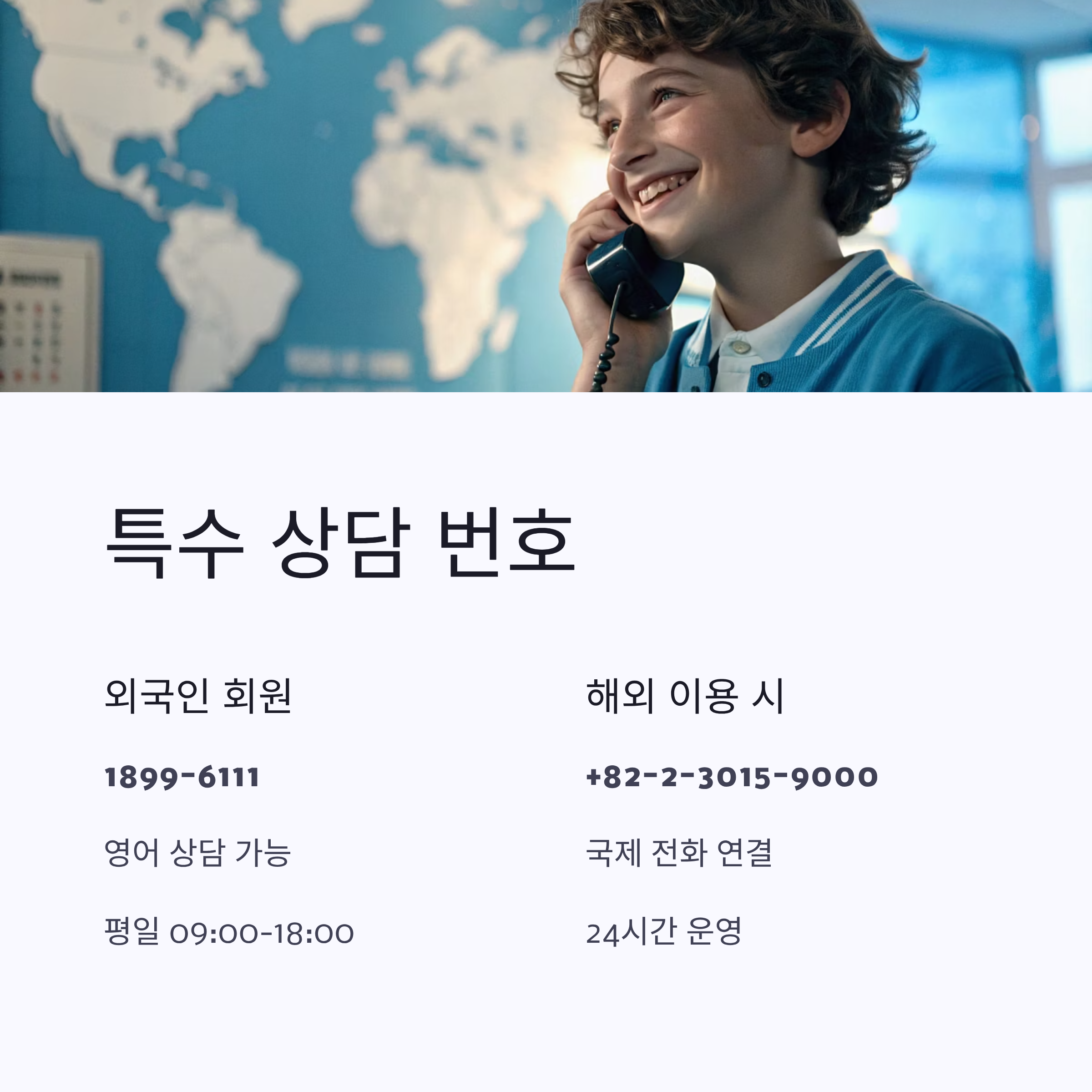 마이 비즈니스 전용 상담이 필요한 개인사업자나 소상공인은 1588-0101번을 이용하세요. 외국인 카드회원을 위한 영어 상담은 1899-6111번이며, 평일 오전 9시부터 오후 6시까지만 운영됩니다. 해외에서 카드를 사용하다가 급할 때는 +82-2-3015-9000번으로 국제 전화를 걸면 됩니다.