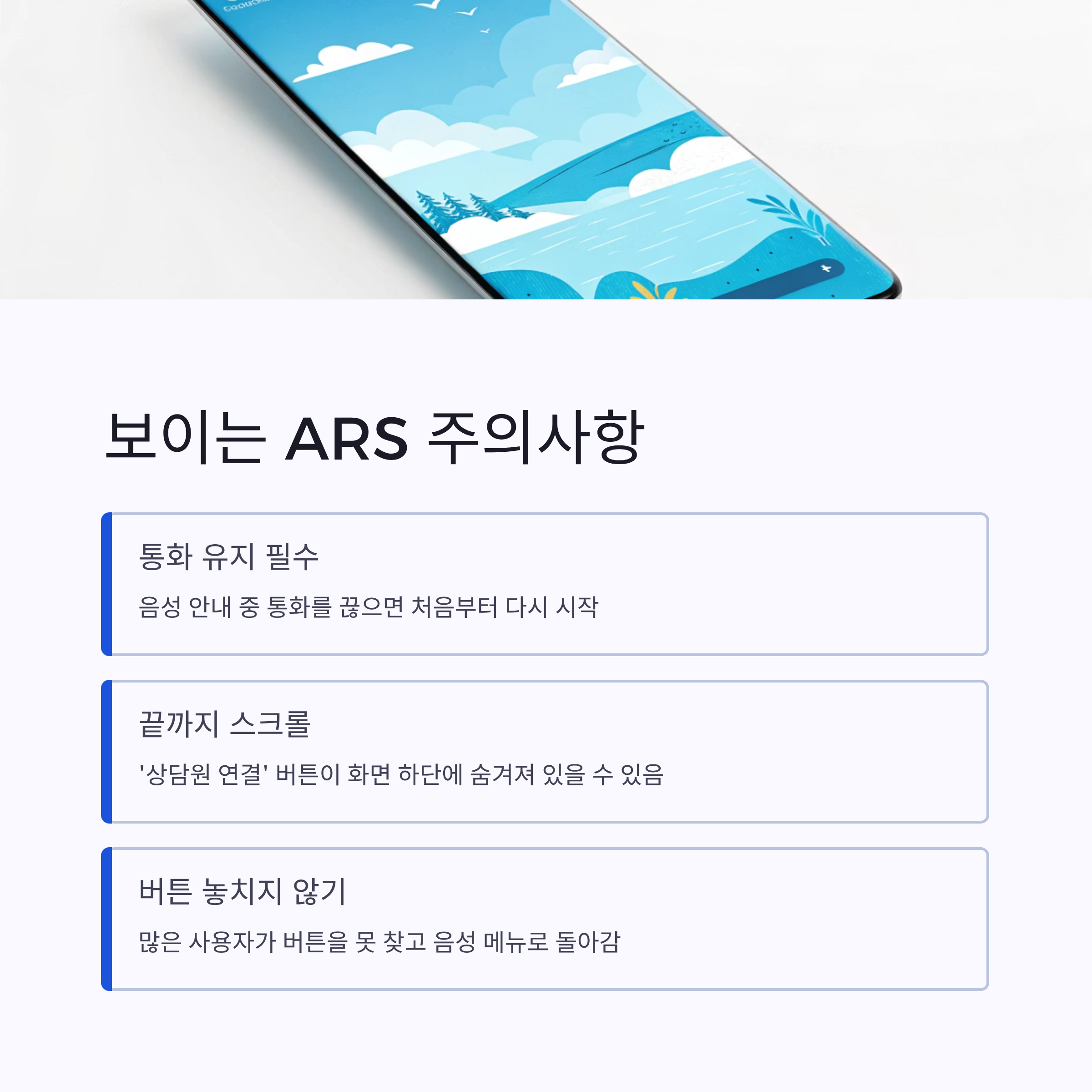 보이는 ARS를 이용할 때 주의할 점은 통화를 끝내지 말고 화면을 계속 봐야 한다는 것입니다. 음성 안내 중에 실수로 통화를 끊으면 처음부터 다시 시작해야 합니다. 또한 보이는 ARS 화면의 '상담원 연결' 버튼이 화면 하단에 숨겨져 있을 수 있으니 끝까지 스크롤해 내려가야 합니다. 일부 사용자들은 이 버튼을 놓치고 음성 메뉴로 돌아가는 경우가 많습니다.