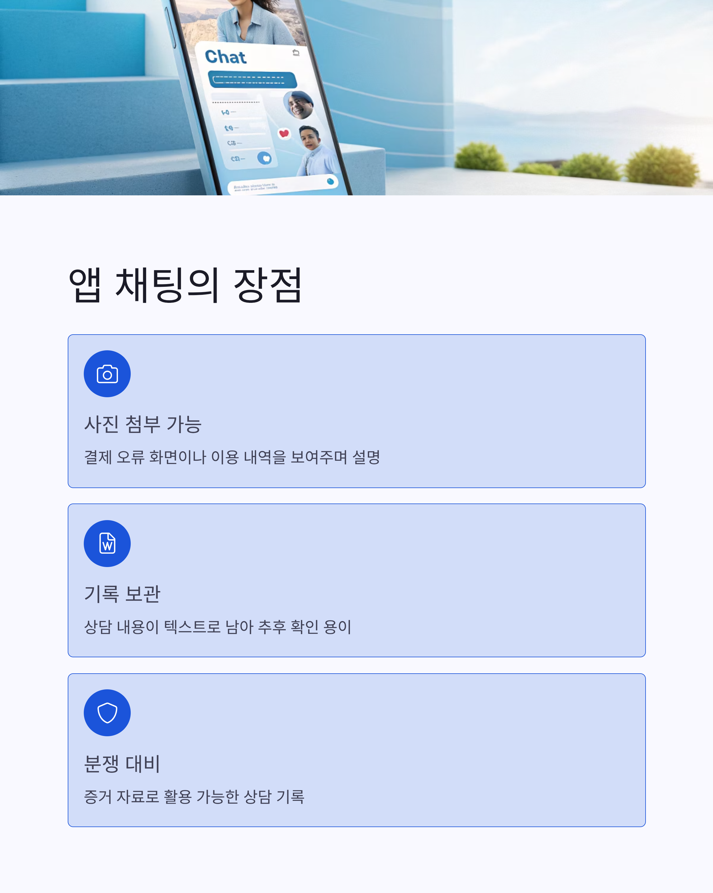 앱 채팅 상담의 운영시간은 평일 오전 9시부터 오후 6시까지입니다. 주말과 공휴일에는 운영하지 않으므로 주의하세요. 상담원이 연결되면 텍스트를 통해 실시간으로 소통할 수 있습니다. 사진도 첨부할 수 있어, 결제 오류 화면이나 이용 내역 사진을 보여주며 설명할 수 있습니다. 이 방식은 전화 상담보다 정확하고 기록이 남아 추후 분쟁 발생 시에도 유용합니다.
