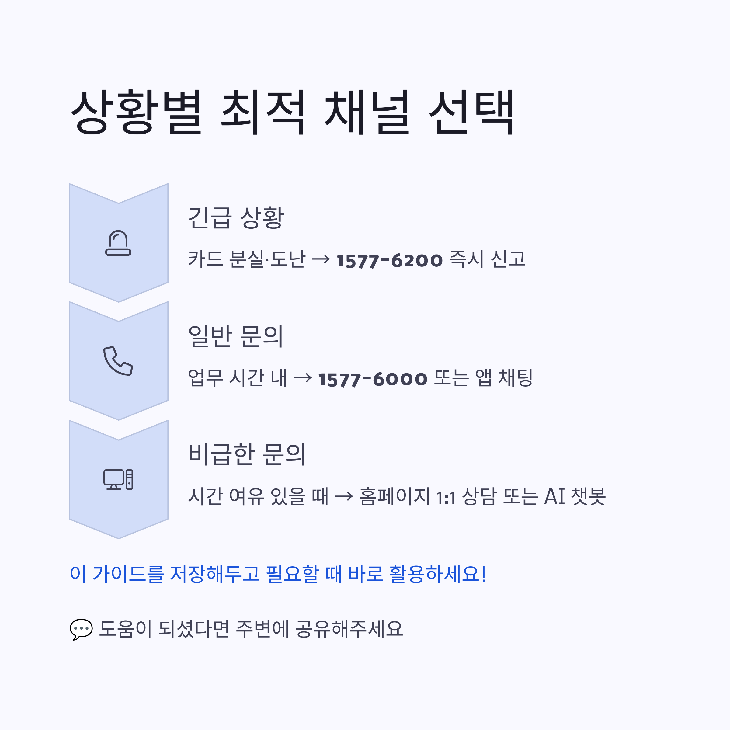 앱 채팅 상담은 평일 오전 9시부터 오후 6시까지만 운영되므로, 저녁이나 주말에 긴급한 상담이 필요하면 1577-6200(분실)이나 1577-6100(대출) 같은 24시간 전용 번호를 이용해야 합니다. 전화 통화료는 일반 통화 요금이 부과되므로, 데이터 요금이 있는 경우 앱 채팅 상담을 이용하면 더 경제적입니다.