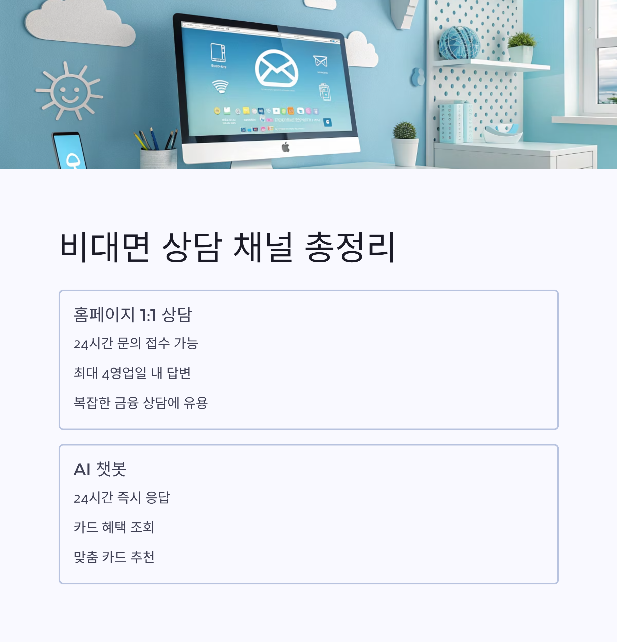 전화가 불편하거나 음성 상담이 어렵다면 홈페이지 1:1 상담도 있습니다. 현대카드 홈페이지에 접속해 로그인한 후 고객지원 메뉴에서 '1:1 상담'을 신청하면 됩니다. 이 방식은 실시간 응답은 아니지만, 24시간 언제든 문의할 수 있고 평일 기준 최대 4영업일 내에 답변을 받을 수 있습니다. 개인정보 변경, 복잡한 금융 상담, 장문의 문의가 필요할 때 유용합니다.