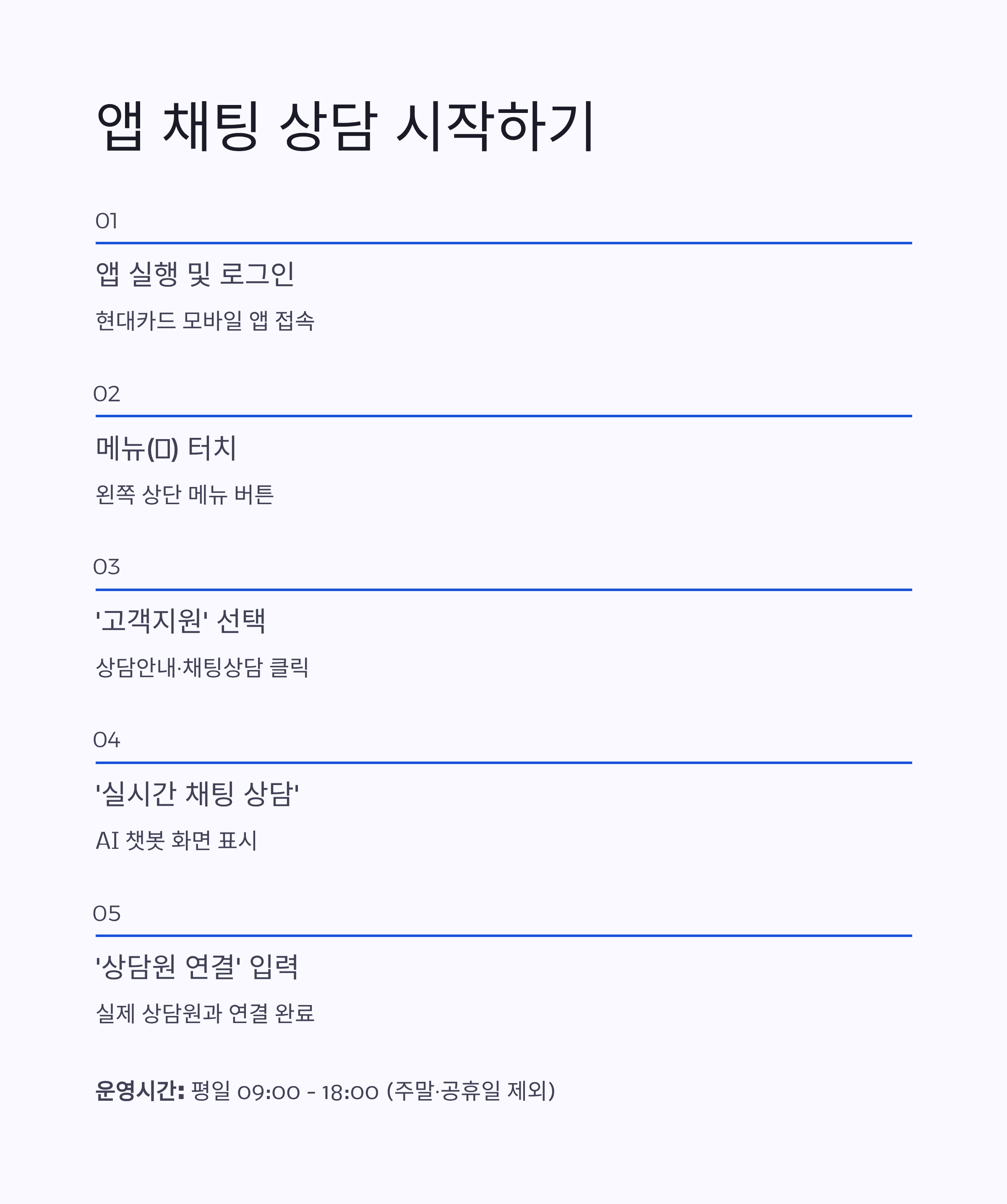 현대카드 앱을 실행하고 로그인한 후, 왼쪽 상단의 메뉴(☰) 버튼을 터치합니다. 메뉴에서 '고객지원'을 선택한 후 '상담안내·채팅상담'을 클릭합니다. 화면에 나타나는 여러 옵션 중 '실시간 채팅 상담'을 선택하면 됩니다. 그러면 먼저 AI 챗봇이 응답하지만, 바로 채팅창에 '상담원 연결'이라고 입력하거나 파란색 '채팅 상담원 연결' 버튼을 클릭하면 실제 상담원과 연결됩니다.
