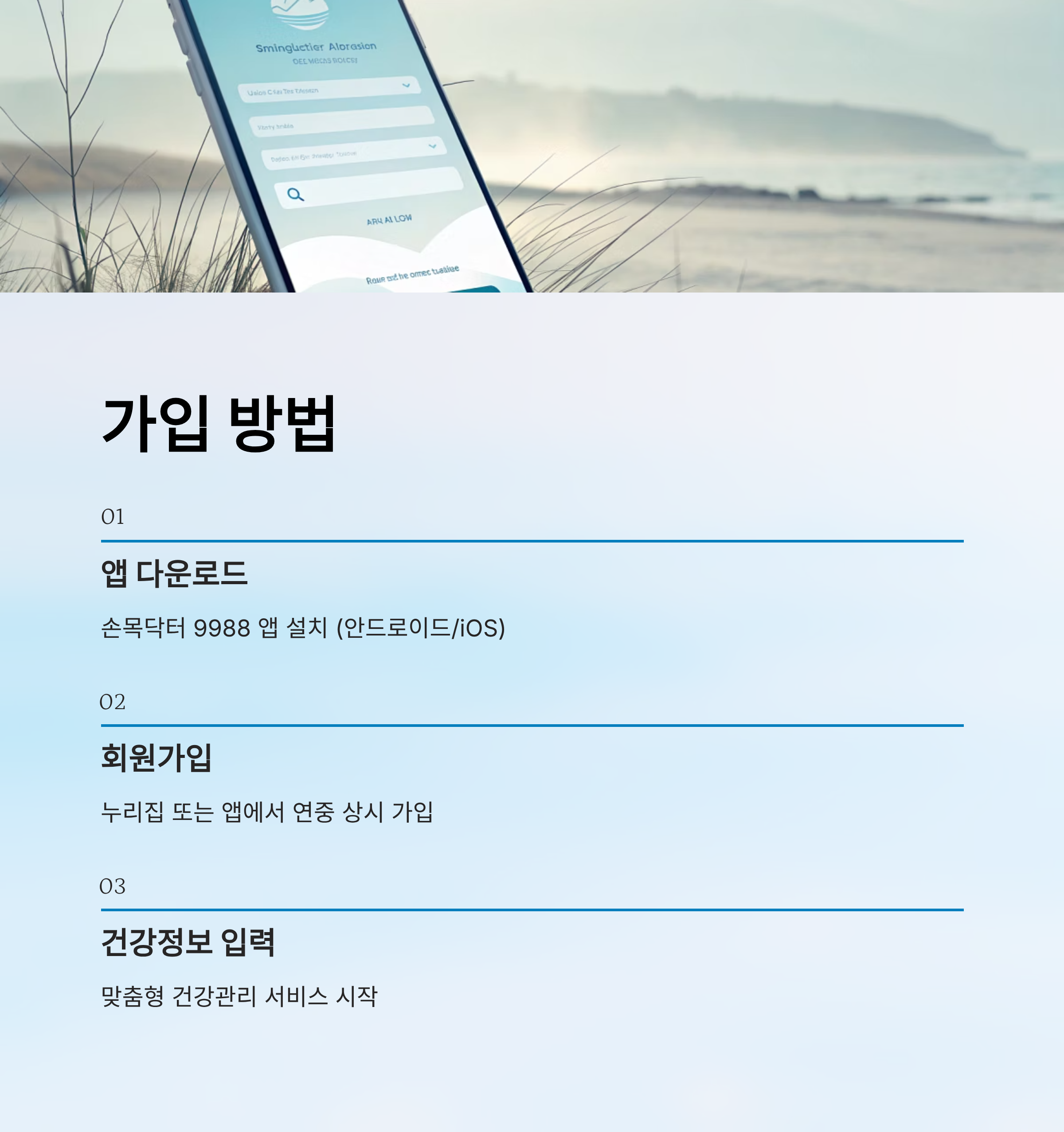 가입은 연중 상시 모집이며, 손목닥터 9988 누리집 또는 스마트폰 앱(안드로이드/iOS)을 통해 가입할 수 있습니다. 가입 후에는 개인의 건강 정보를 입력하며, 이를 바탕으로 앱이 맞춤형 건강 관리 서비스를 제공합니다.