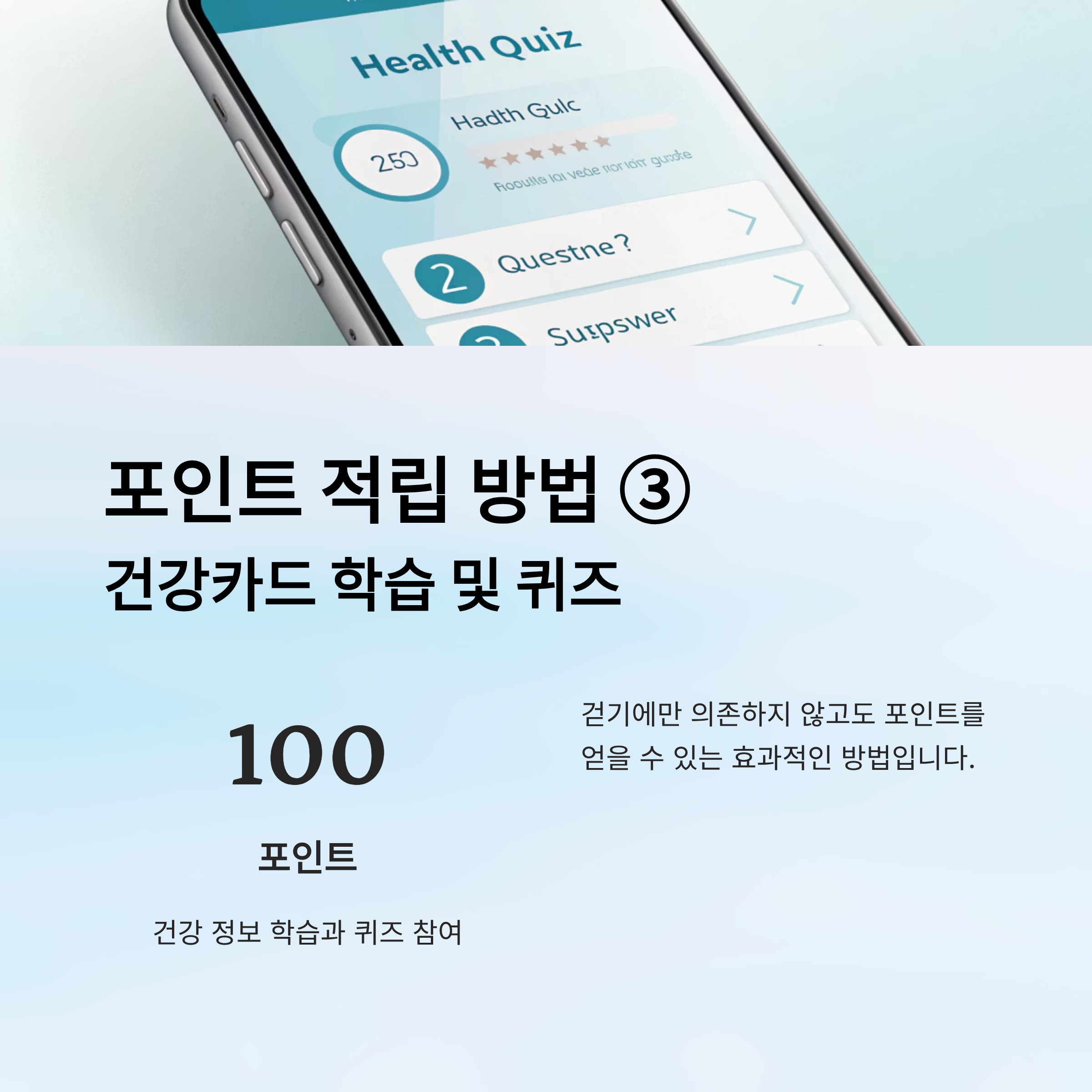 앱 내 건강카드에서 건강 정보를 학습하고 퀴즈에 참여하면 100포인트를 적립할 수 있습니다. 이는 단순히 걷기에만 의존하지 않고도 포인트를 얻을 수 있는 효과적인 방법입니다.