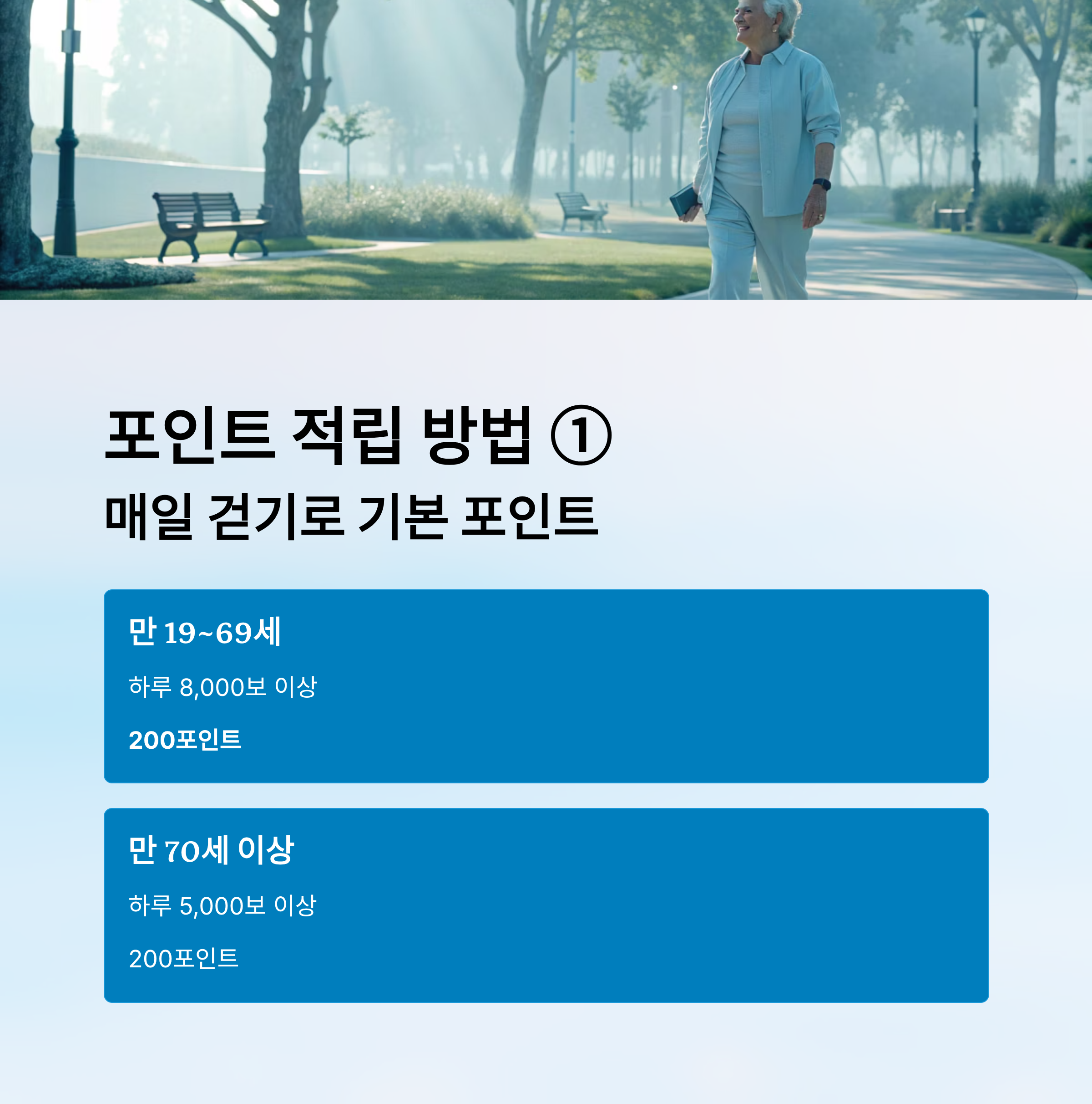 가장 기본적인 포인트 적립 방법은 매일 걷기입니다. 만 19~69세는 하루 8,000보 이상 걷기를 달성하면 200포인트를 받습니다. 만 70세 이상의 어르신은 5,000보 이상 걷기만 해도 200포인트를 얻을 수 있습니다.