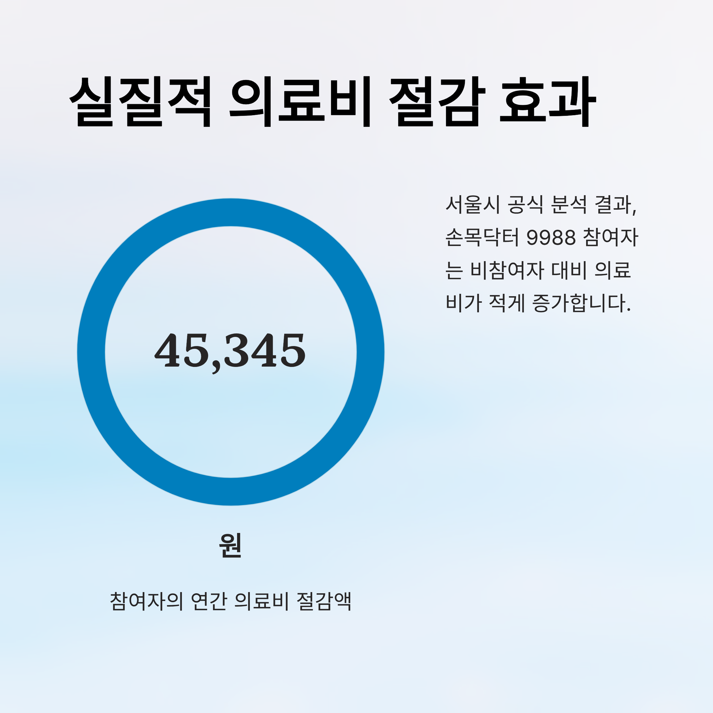 최근 서울시의 공식 분석에 따르면 손목닥터 9988 참여자는 비참여자 대비 연간 의료비가 4만 5,345원 적게 증가하는 것으로 나타났습니다. 이는 단순한 건강관리를 넘어 실질적인 의료비 절감 효과로 이어지는 중요한 의미를 갖습니다.