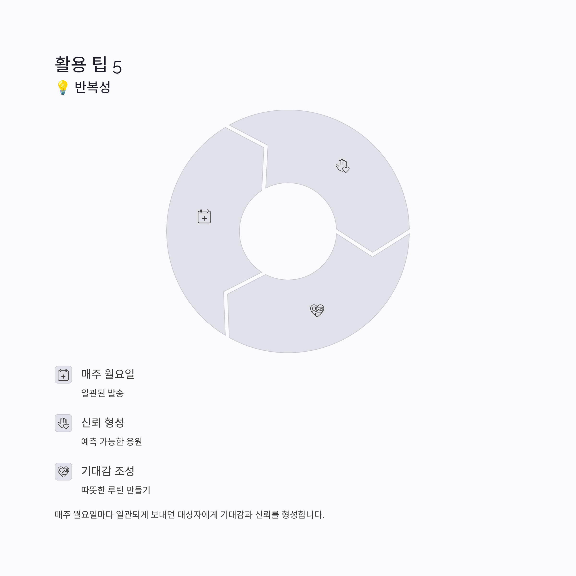 매주 월요일마다 일관되게 보내면 대상자에게 기대감과 신뢰를 형성합니다